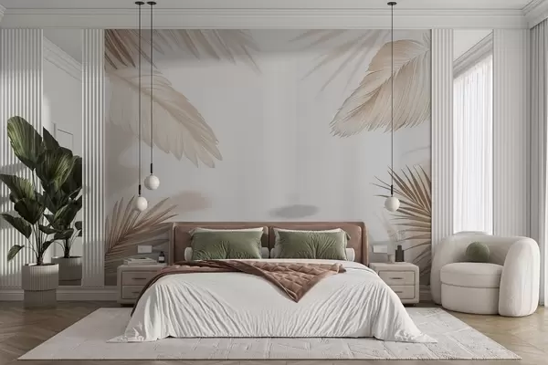 Fototapet Beige tropisk inredning med silhuetter av palmblad och mjuka skuggor Nr. w09714