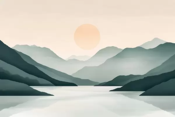 Fototapet Lugnt bergslandskap med solen över sjön Nr. w09735