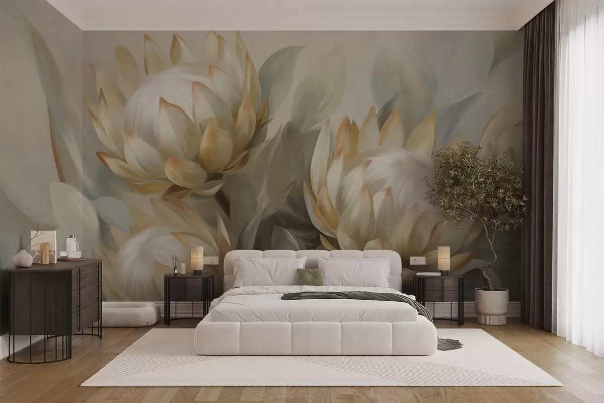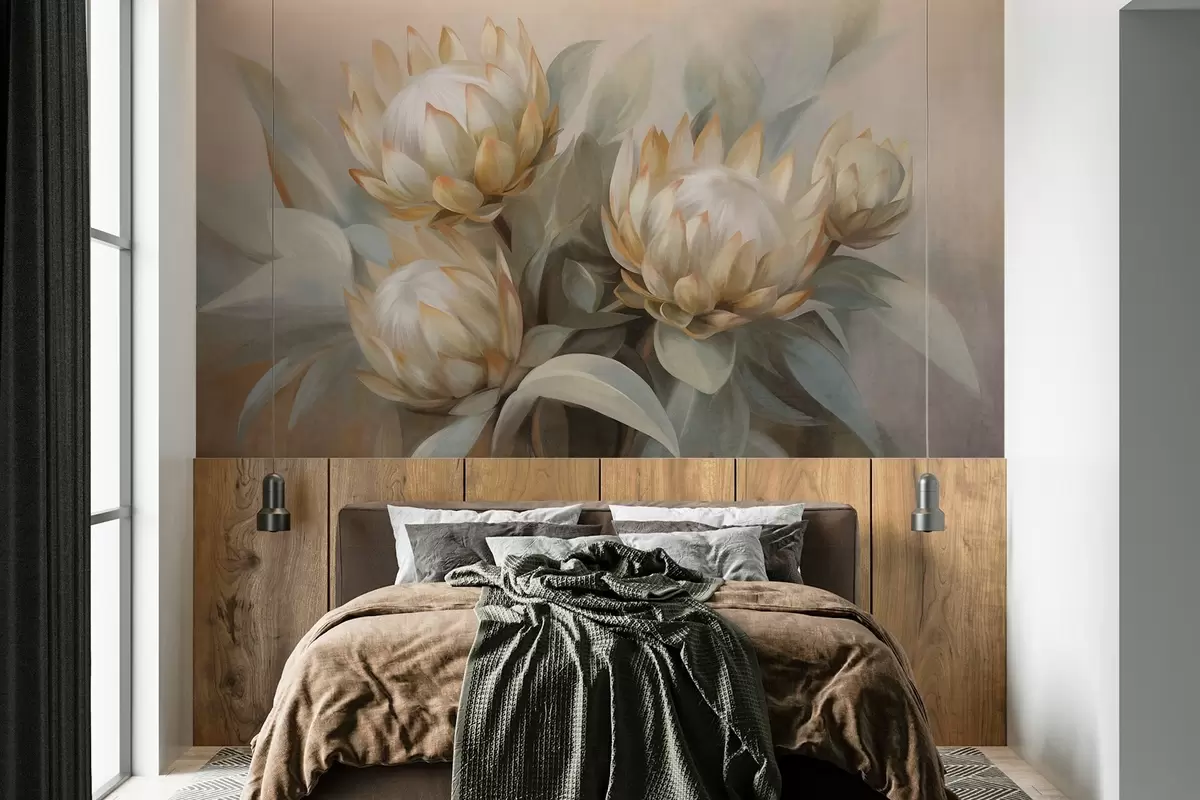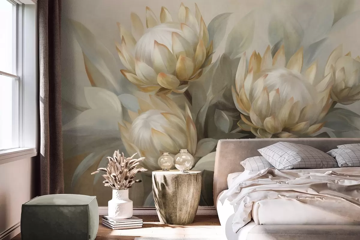 Fototapet Strukturerade proteablommor med gröna blad och en mjuk, suddig bakgrund Nr. w09738