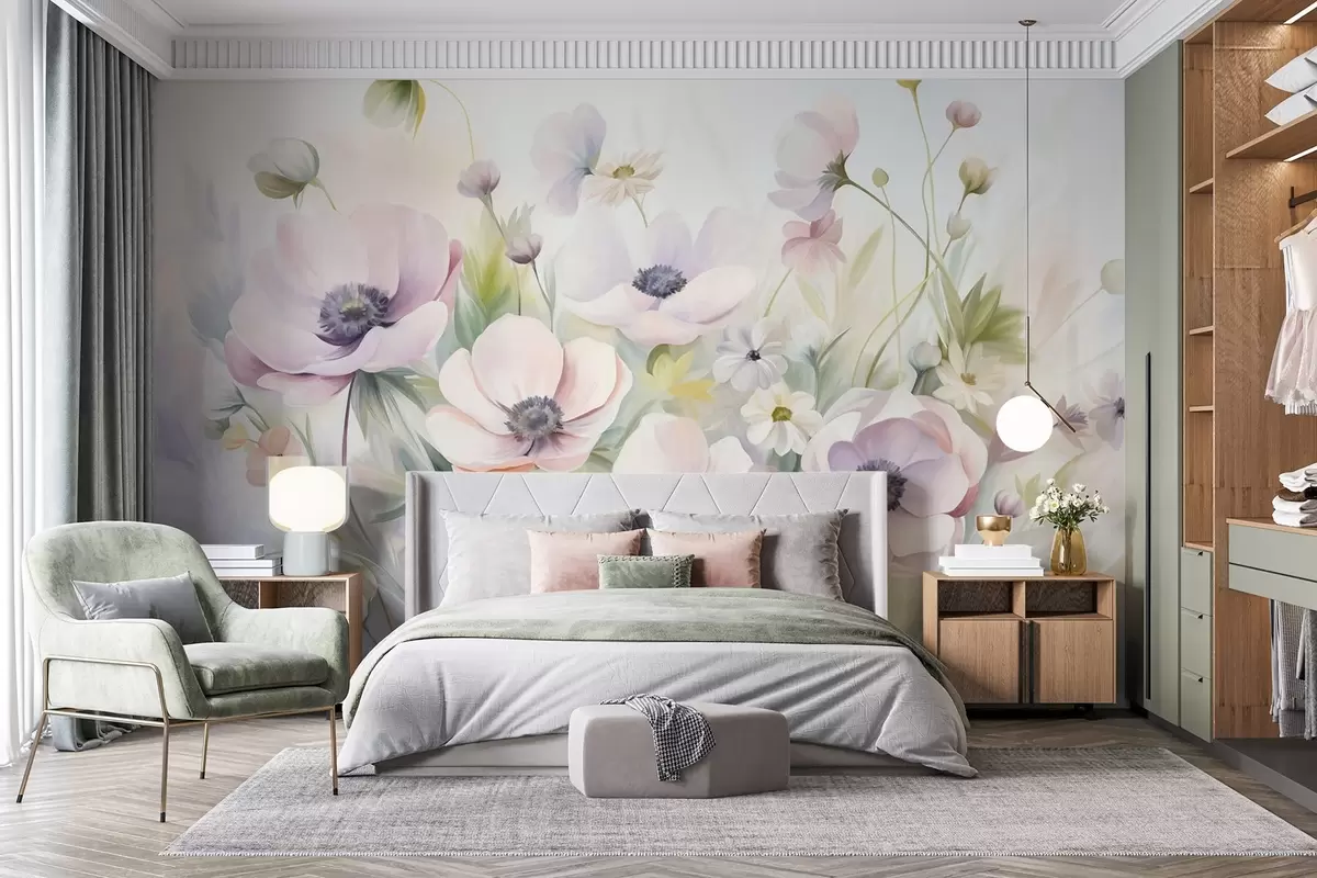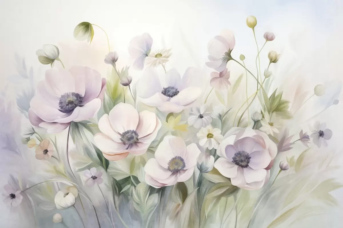 Fototapet Ett fält med pastellrosa och vita anemonblommor, grönt bladverk och små vita prästkragar. Nr. w09742