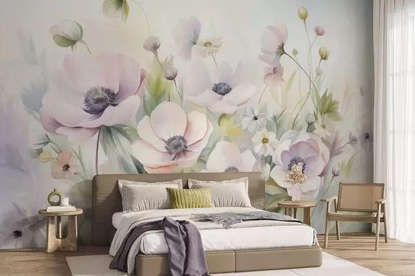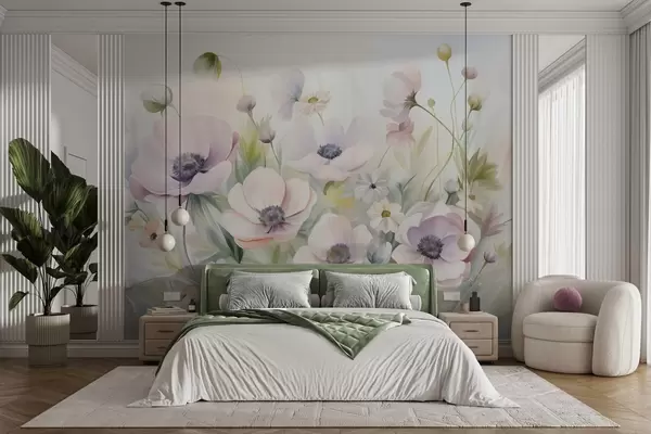 Fototapet Ett fält med pastellrosa och vita anemonblommor, grönt bladverk och små vita prästkragar. Nr. w09742