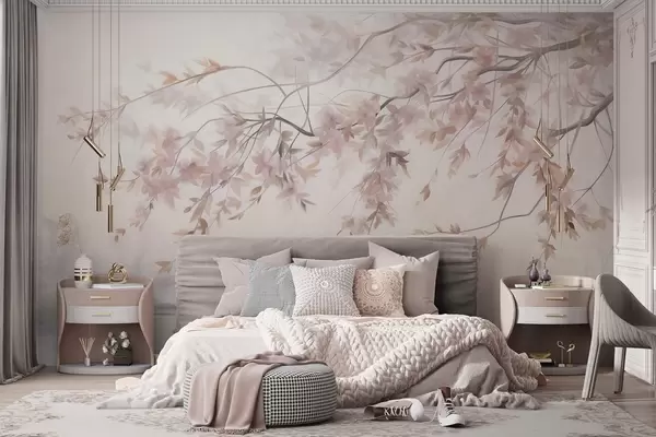 Fototapet Strukturerat landskap med körsbärsblomgren, rosa löv, mjuk, dimmig bakgrund Nr. w09743