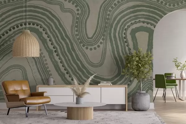 Fototapet Abstrakta gröna och beige vågiga linjer och prickar, modern texturerad konst Nr. w09747
