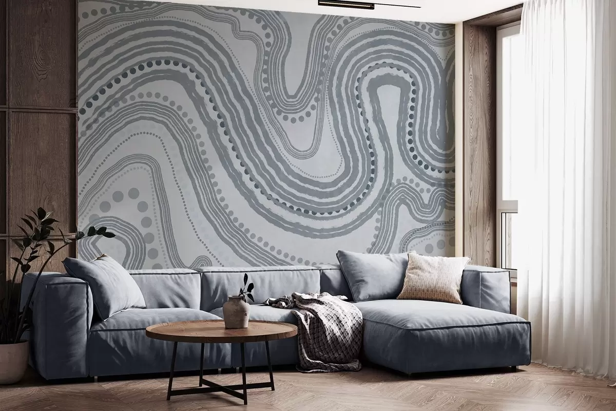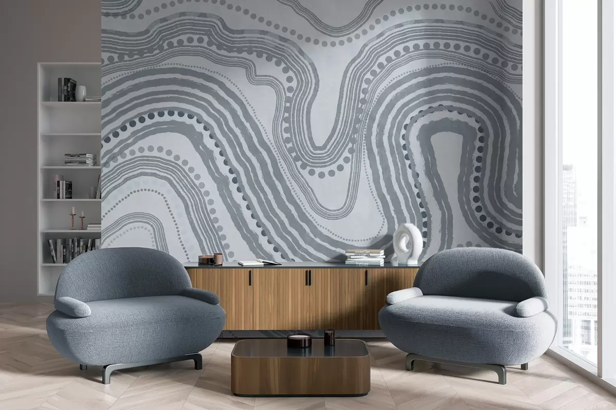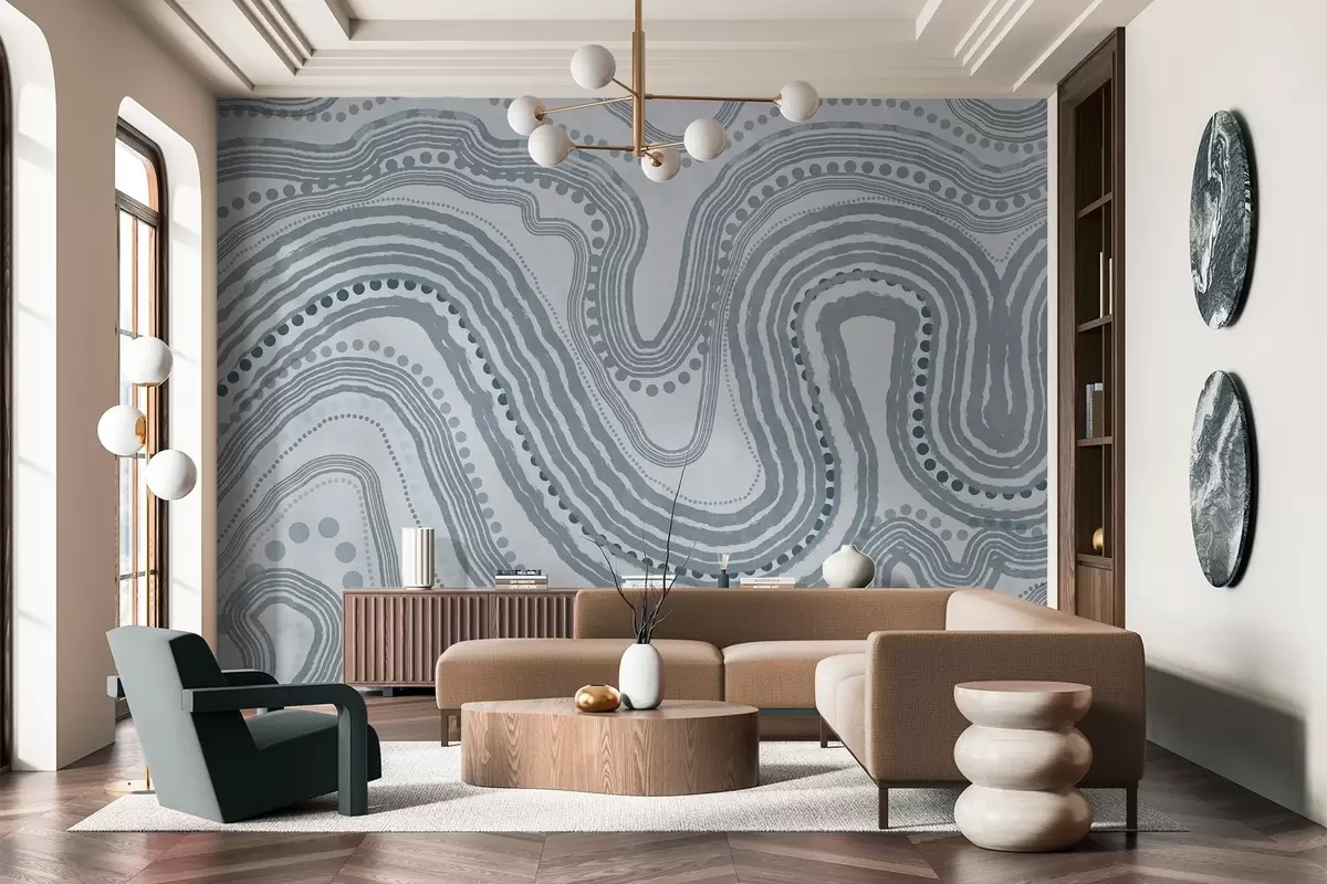 Fototapet Abstrakta blå vågiga linjer och prickar, modern texturerad konst Nr. w09747v3
