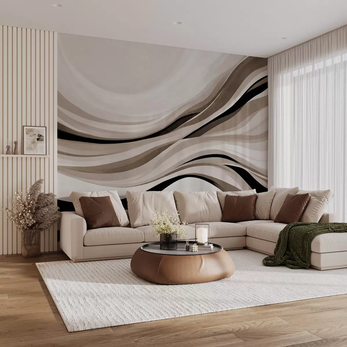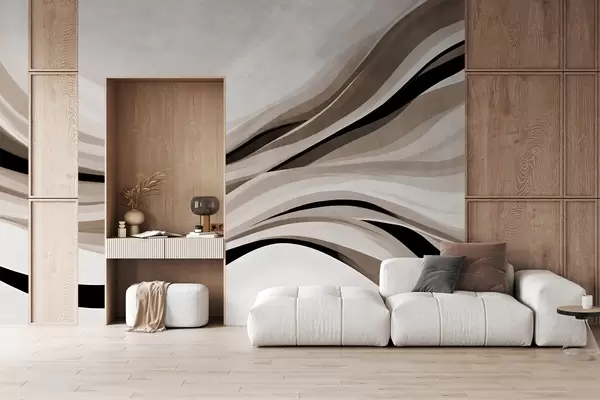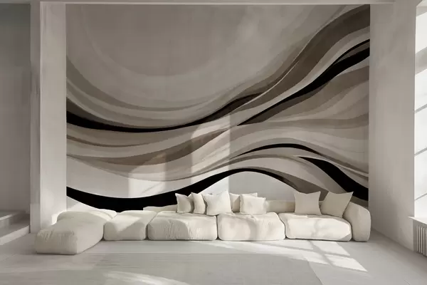 Fototapet Abstrakta vågiga linjer i beige och svarta nyanser mot en ljus bakgrund, texturerad konst Nr. w09748