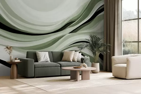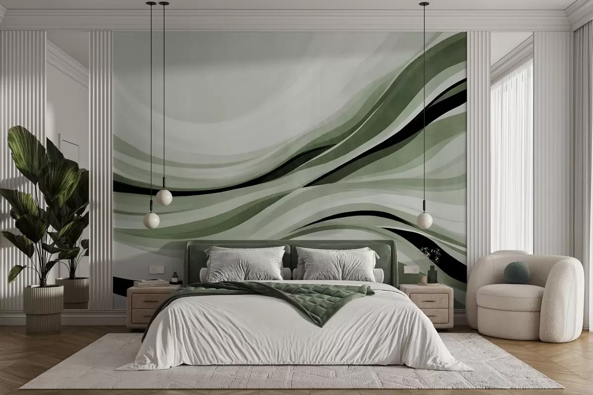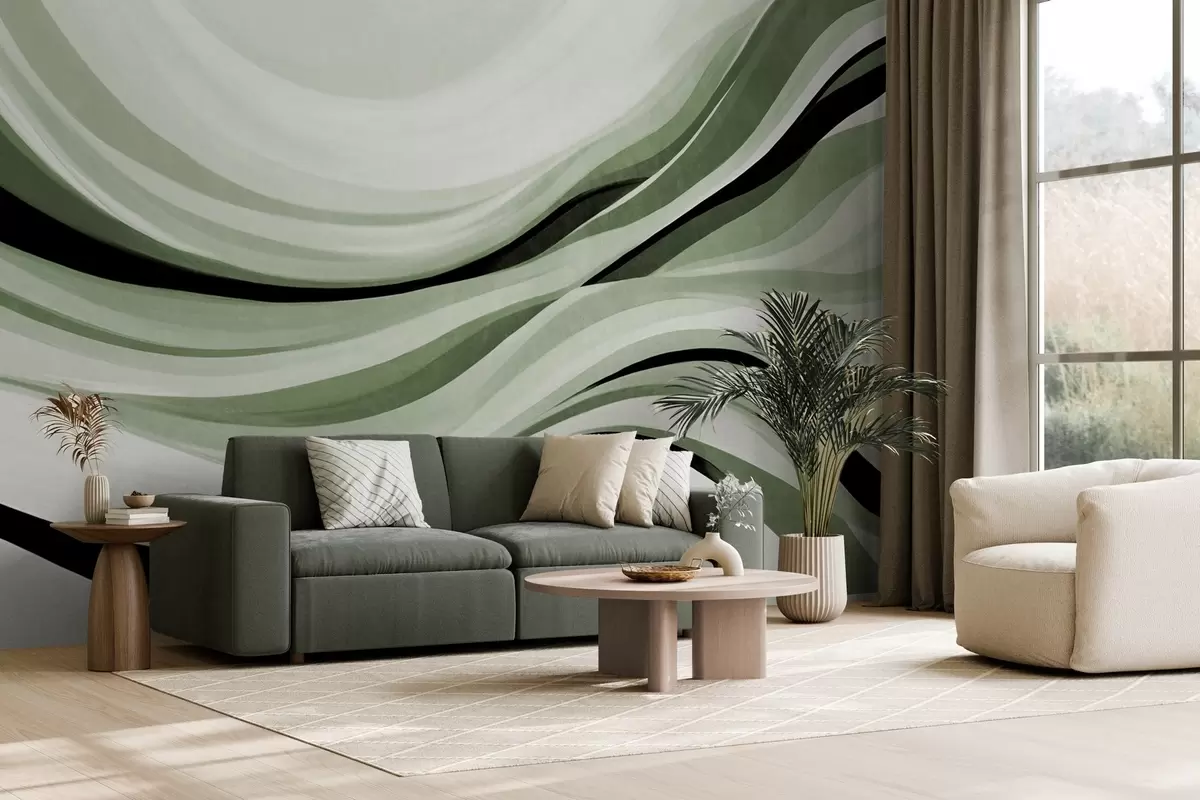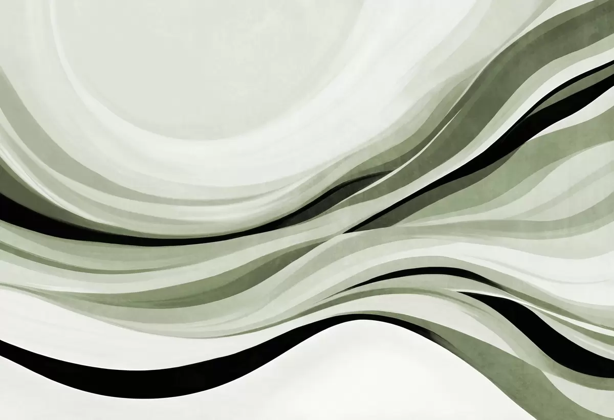 Fototapet Abstrakta vågiga linjer i nyanser av grönt och svart mot en ljus bakgrund, texturerad konst Nr. w09748v1