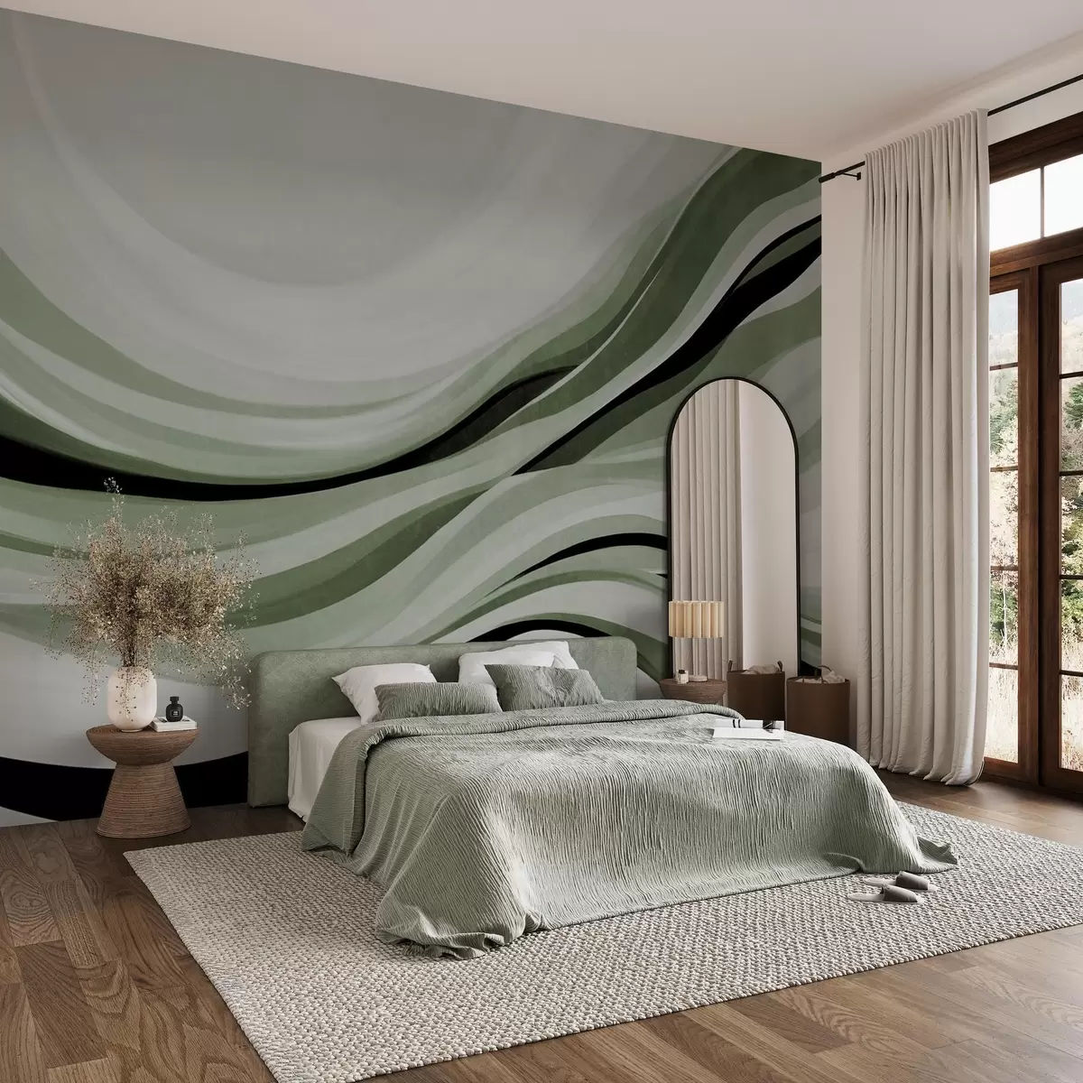 Fototapet Abstrakta vågiga linjer i nyanser av grönt och svart mot en ljus bakgrund, texturerad konst Nr. w09748v1