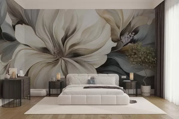 Fototapet Stora, krämiga magnoliablommor med bruna och grå blad, mjuk belysning, abstrakt bakgrund Nr. w09749