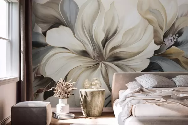Fototapet Stora, krämiga magnoliablommor med bruna och grå blad, mjuk belysning, abstrakt bakgrund Nr. w09749