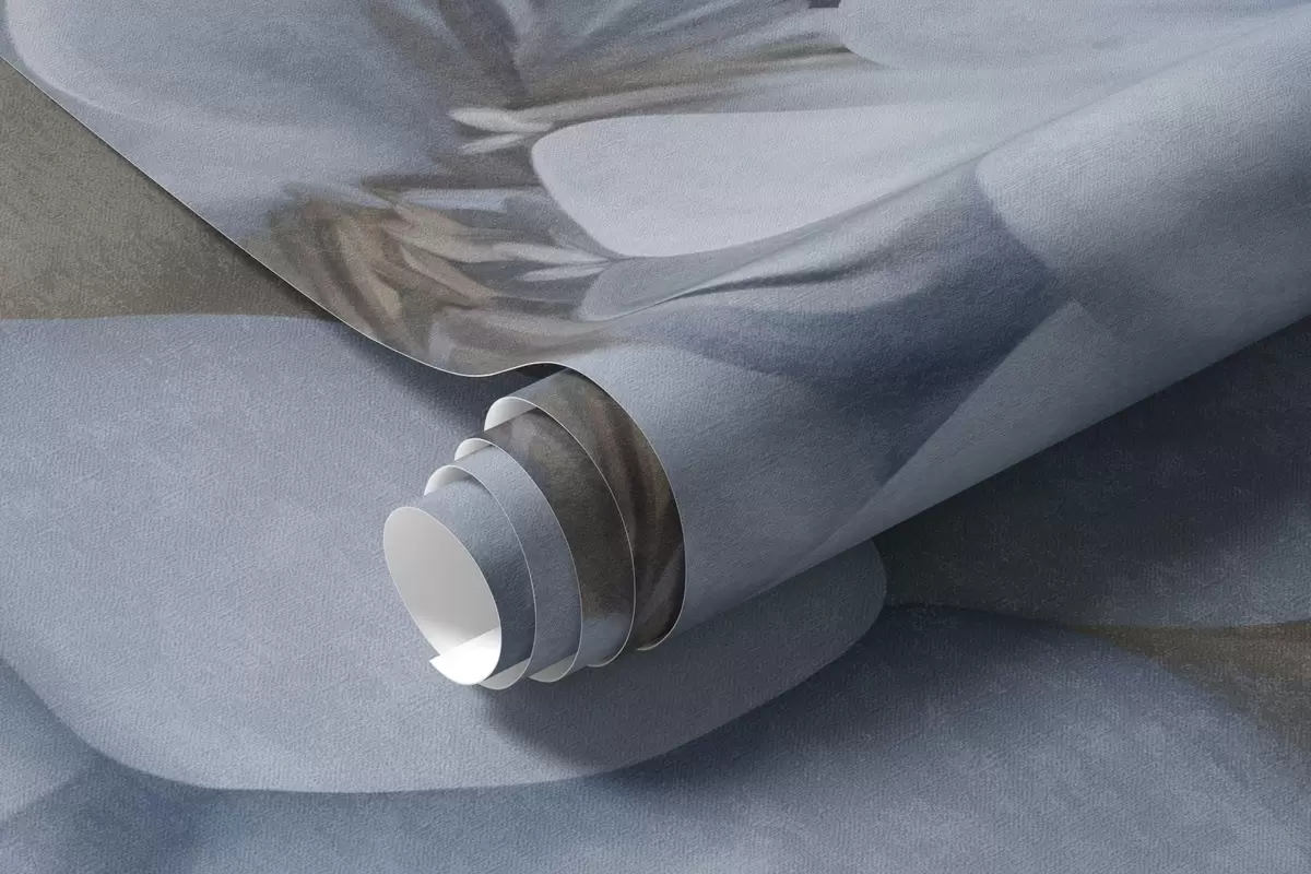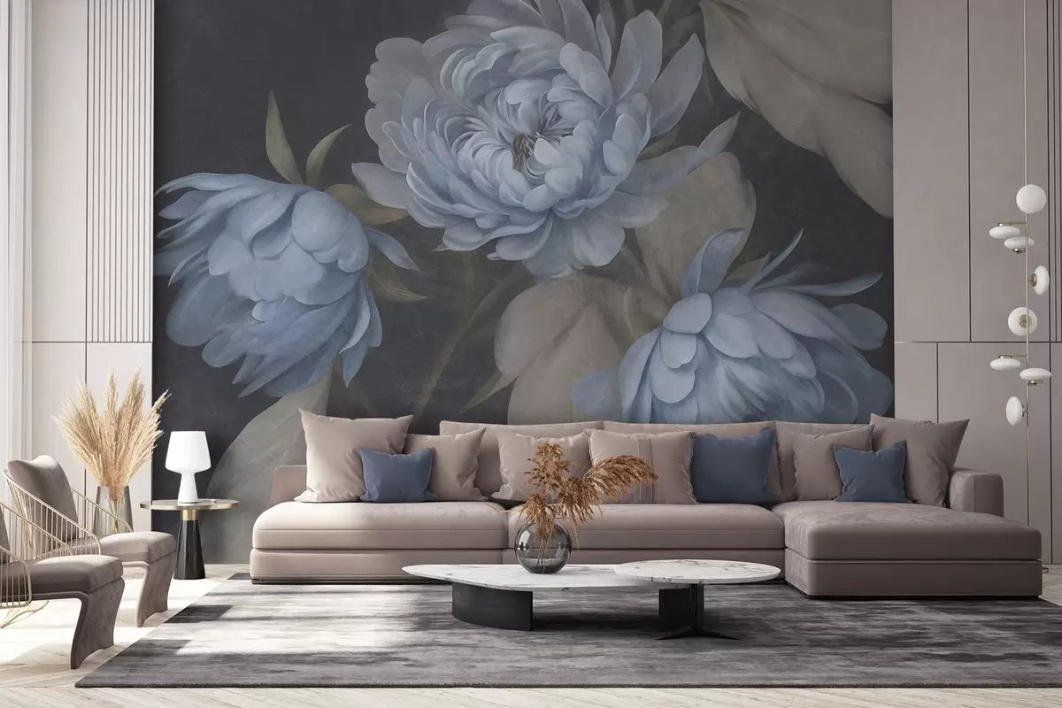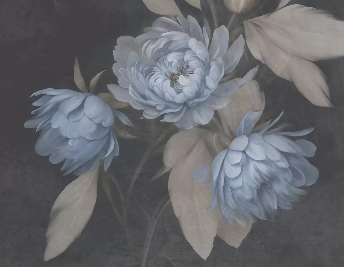 Fototapet Strukturerade ljusblå pionblommor med beige blad mot en mörk bakgrund Nr. w09751