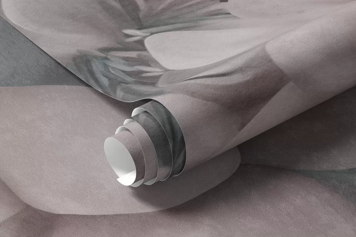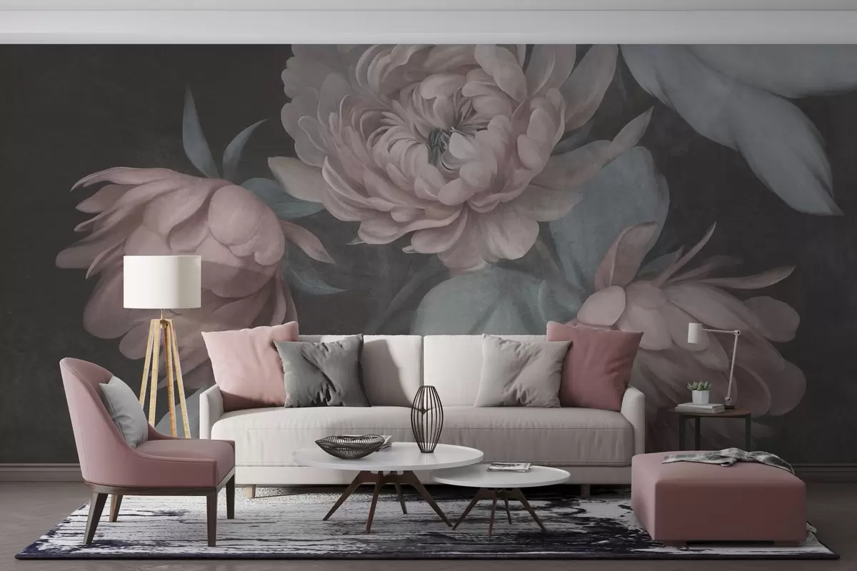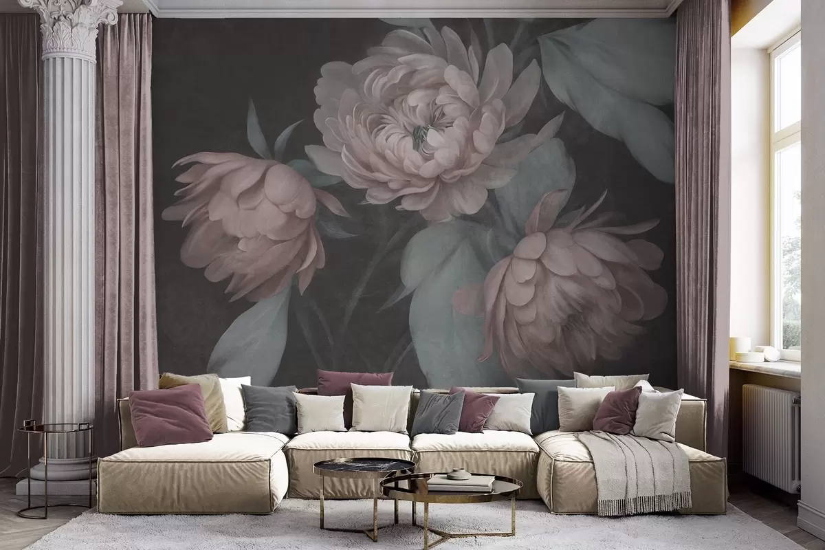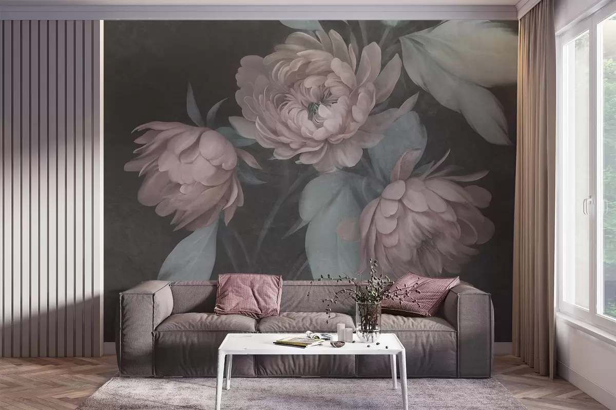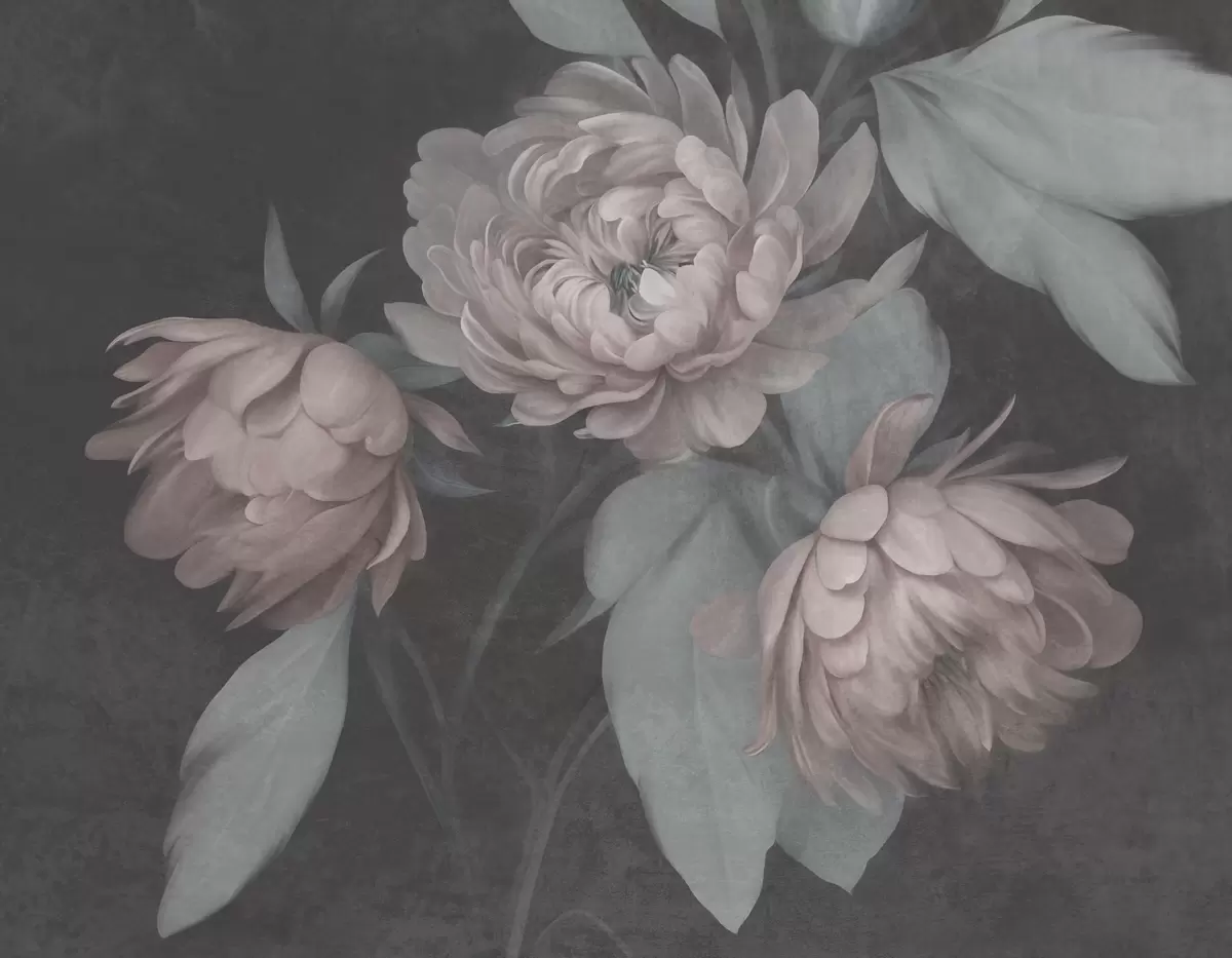 Fototapet Strukturerade ljusrosa pionblommor med dämpade gröna blad mot en mörk bakgrund Nr. w09751v1