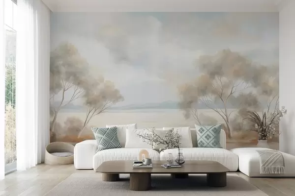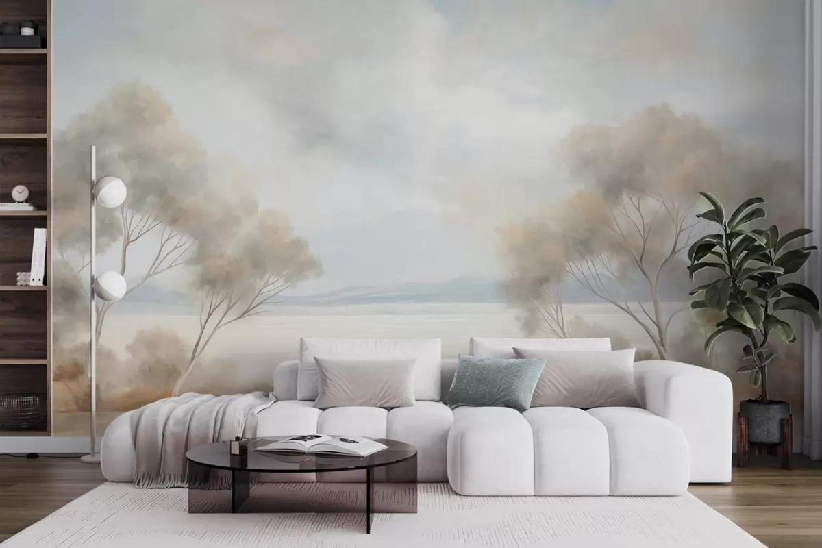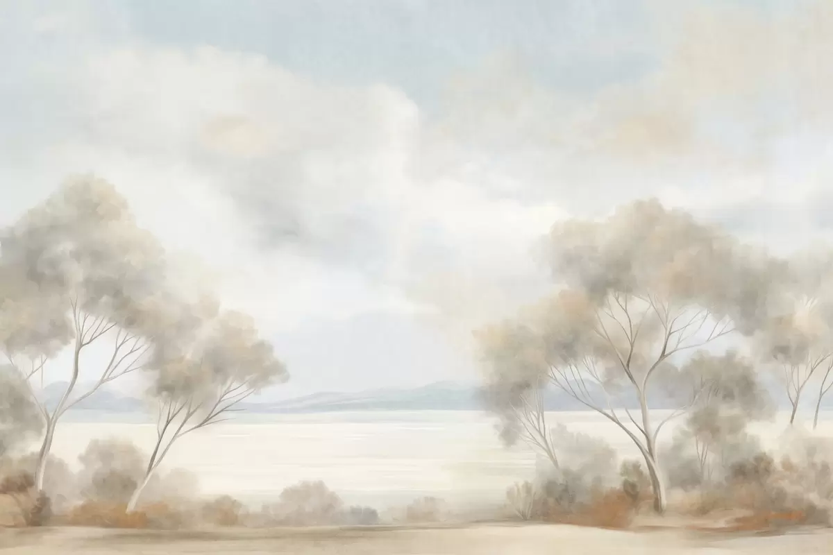 Fototapet En landskapsmålning med textur och träd under ett molnigt himmel Nr. w09753
