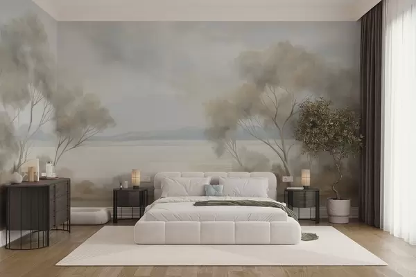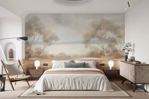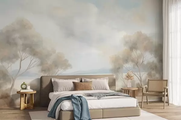 Fototapet En landskapsmålning med textur och träd under ett molnigt himmel Nr. w09753