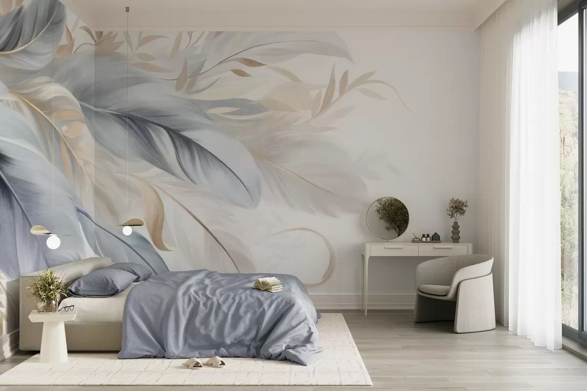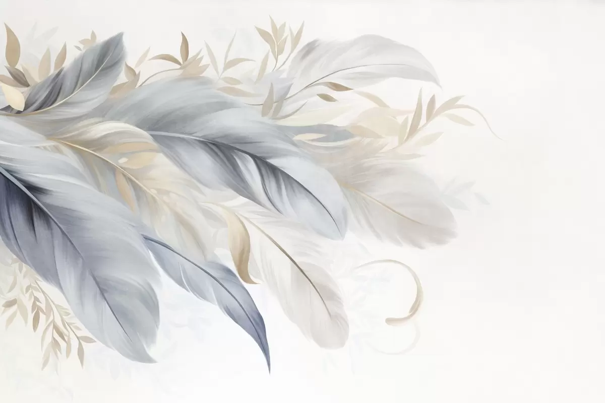 Fototapet Strukturerade fjädrar i pastellfärger och fina blad mot en ljus bakgrund Nr. w09763
