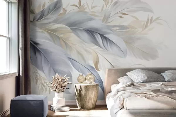 Fototapet Strukturerade fjädrar i pastellfärger och fina blad mot en ljus bakgrund Nr. w09763