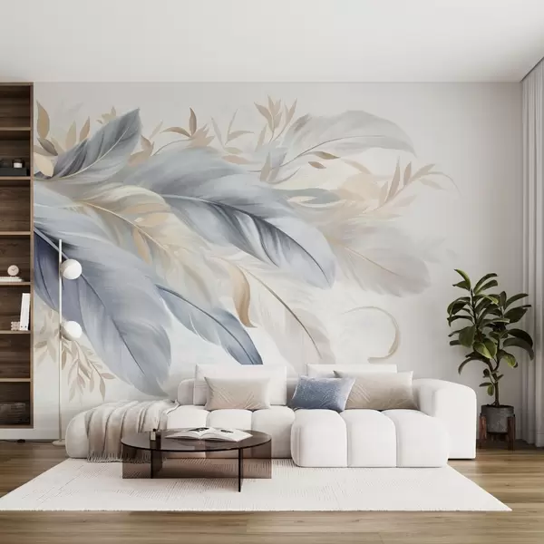Fototapet Strukturerade fjädrar i pastellfärger och fina blad mot en ljus bakgrund Nr. w09763