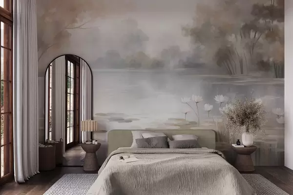 Fototapet Ett landskap med varierande struktur, en sjö med vita näckrosor, omgiven av träd i dämpade färger Nr. w09768