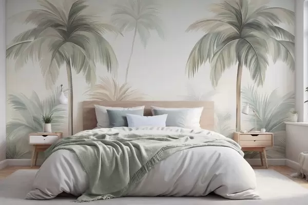 Fototapet Palmer med strukturerade blad i dämpade gröna och beige nyanser mot en ljus himmel Nr. w09770