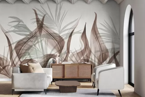 Fototapet Tropiska blad i nyanser av brunt och grönt mot en vit bakgrund, texturerad akvarellstil Nr. w09772
