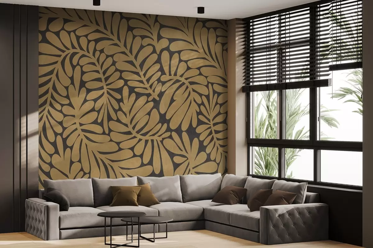 Fototapet Stiliserade senapsgula blad mot en mörkgrå bakgrund, texturerad konst Nr. w09775