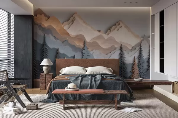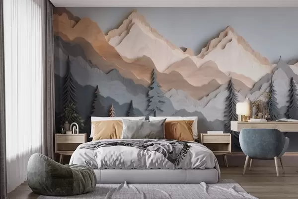 Fototapet Naturlandskap med tallar och berg i snidat trä Nr. w09793