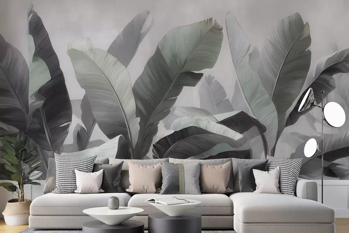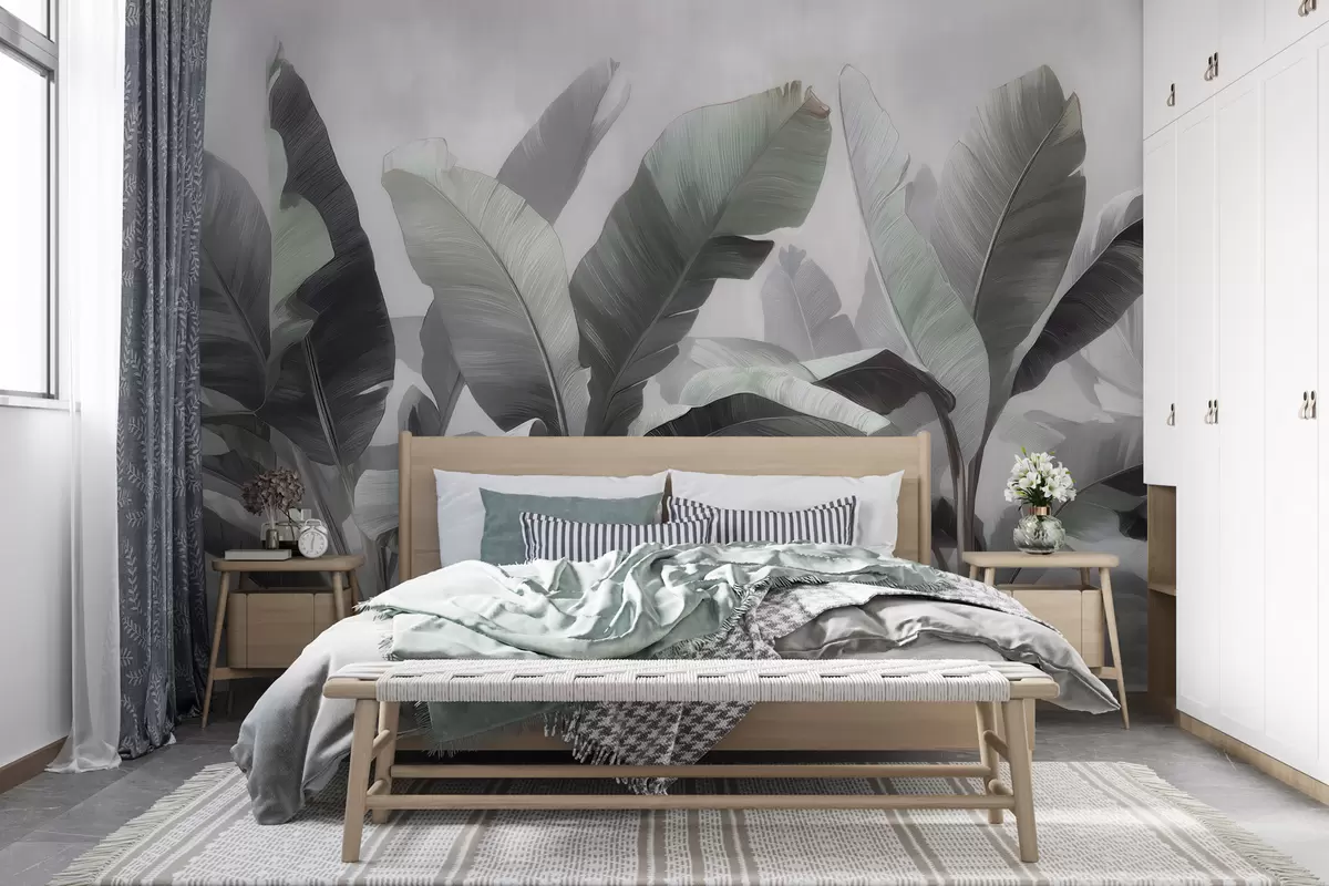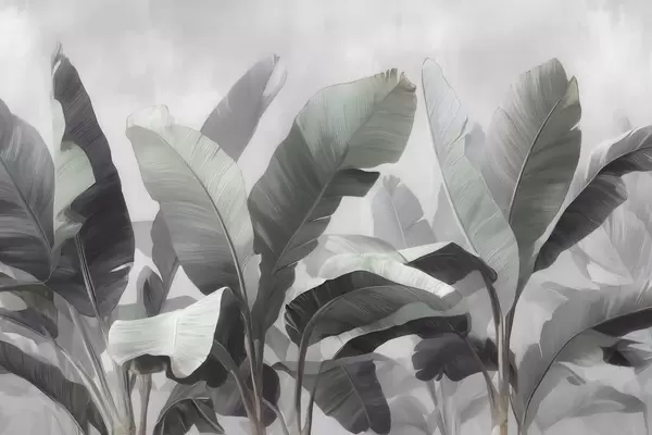 Fototapet Abstrakta, stora bananblad i en neutral färgskala med mjuka grågröna nyanser Nr. w09805