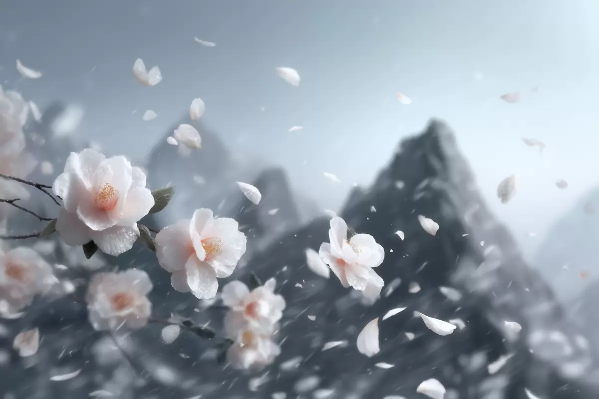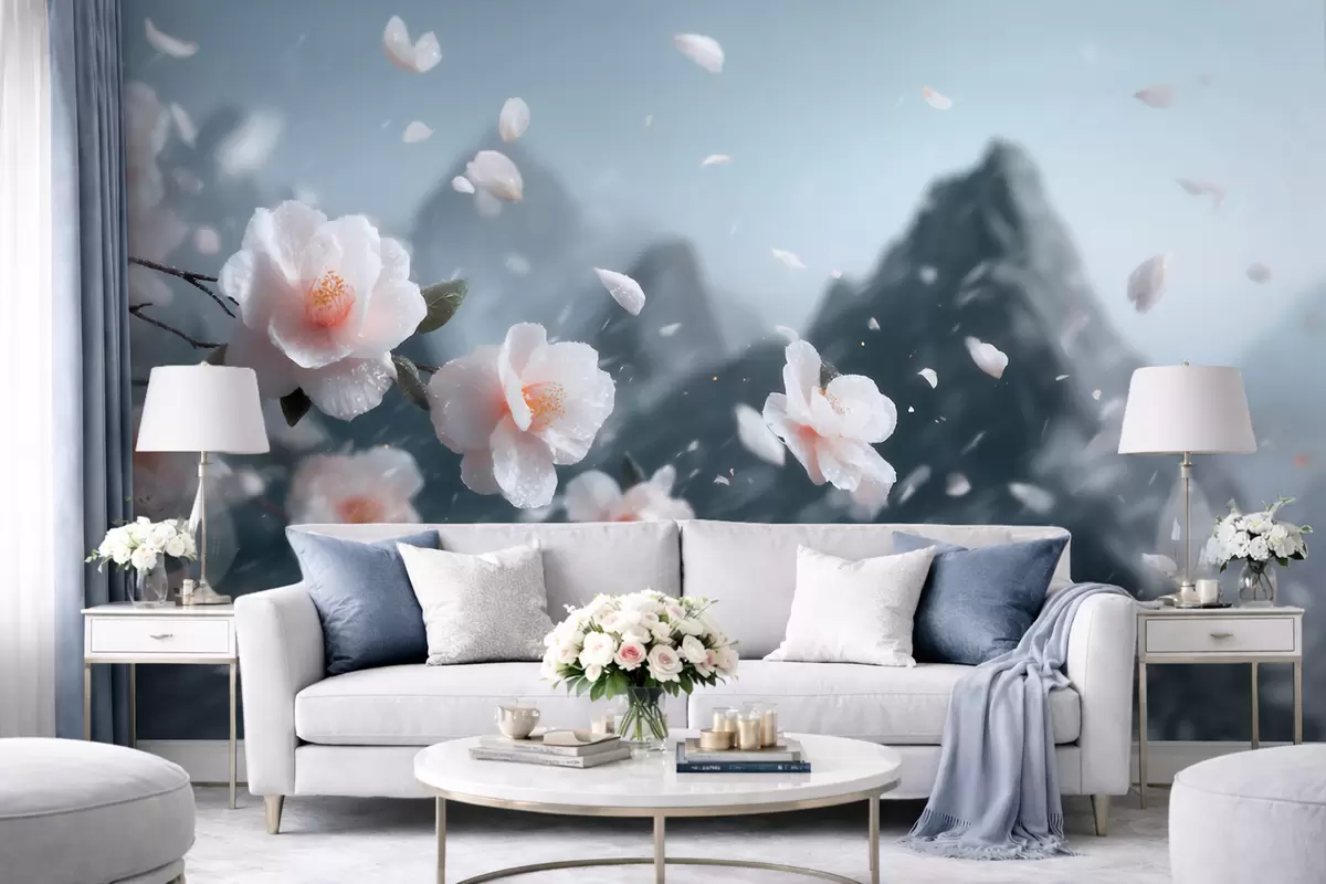 Fototapet Ömtåliga körsbärsblommor mot en bergsbakgrund, stämningsfullt japanskt landskap i pastellfärger Nr. w09808