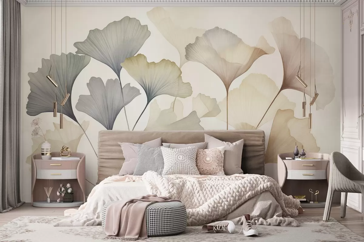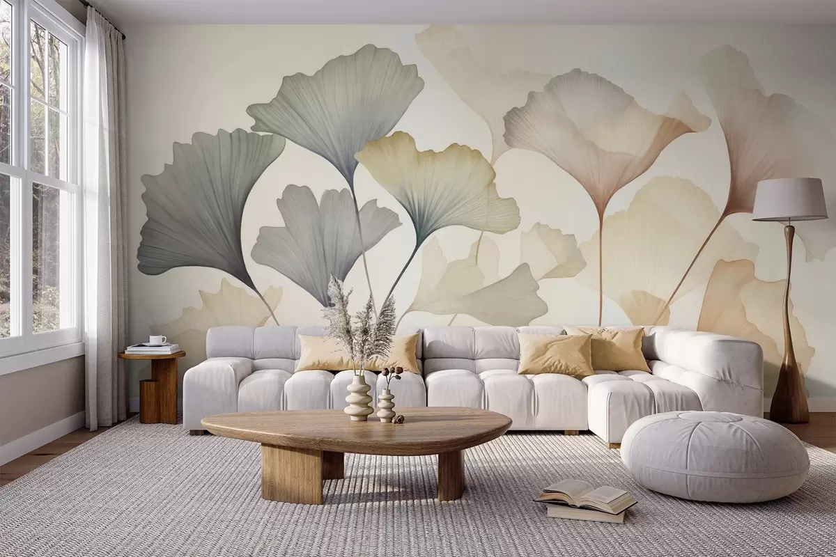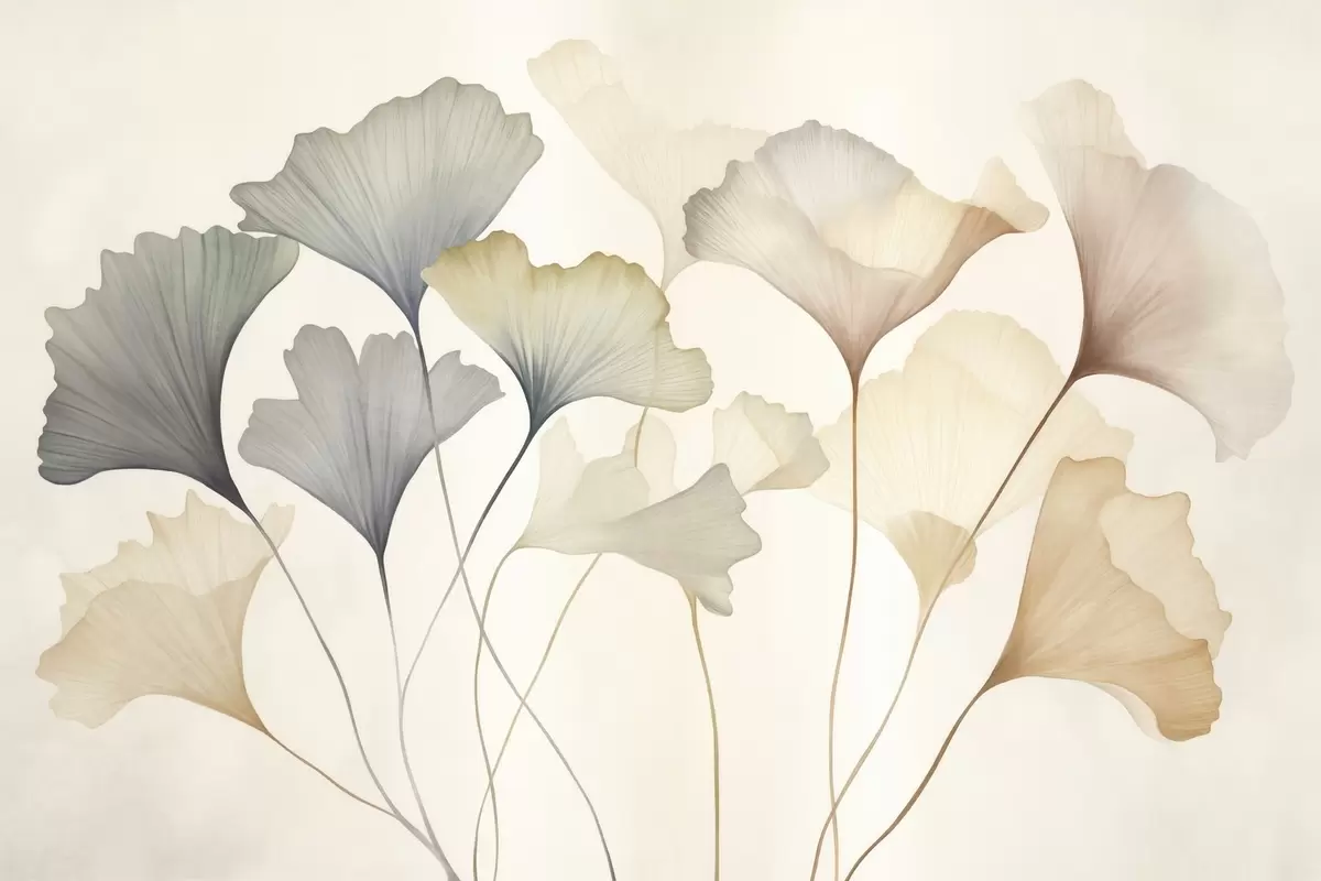Fototapet Abstrakt konst med ginkgoblad i dämpade pastellfärger som blått, grönt och persikofärgat Nr. w09810