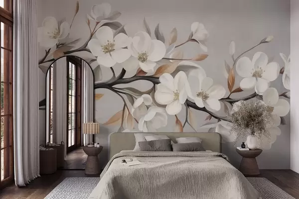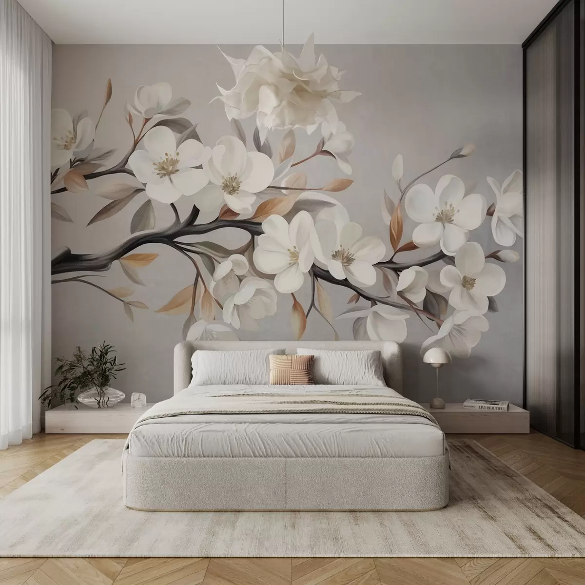 Fototapet En gren med struktur, vita blommor och bruna blad mot en ljusgrå bakgrund Nr. w09817