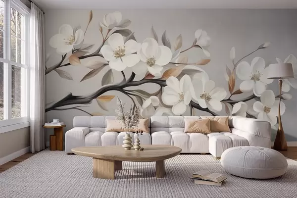 Fototapet En gren med struktur, vita blommor och bruna blad mot en ljusgrå bakgrund Nr. w09817