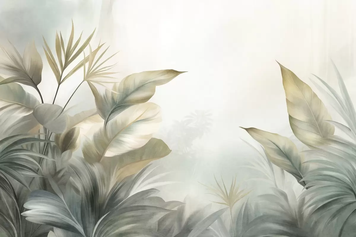 Fototapet Stora, strukturerade tropiska blad i dämpade gröna och beige nyanser, en djungelmiljö Nr. w09820