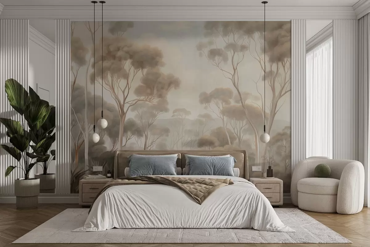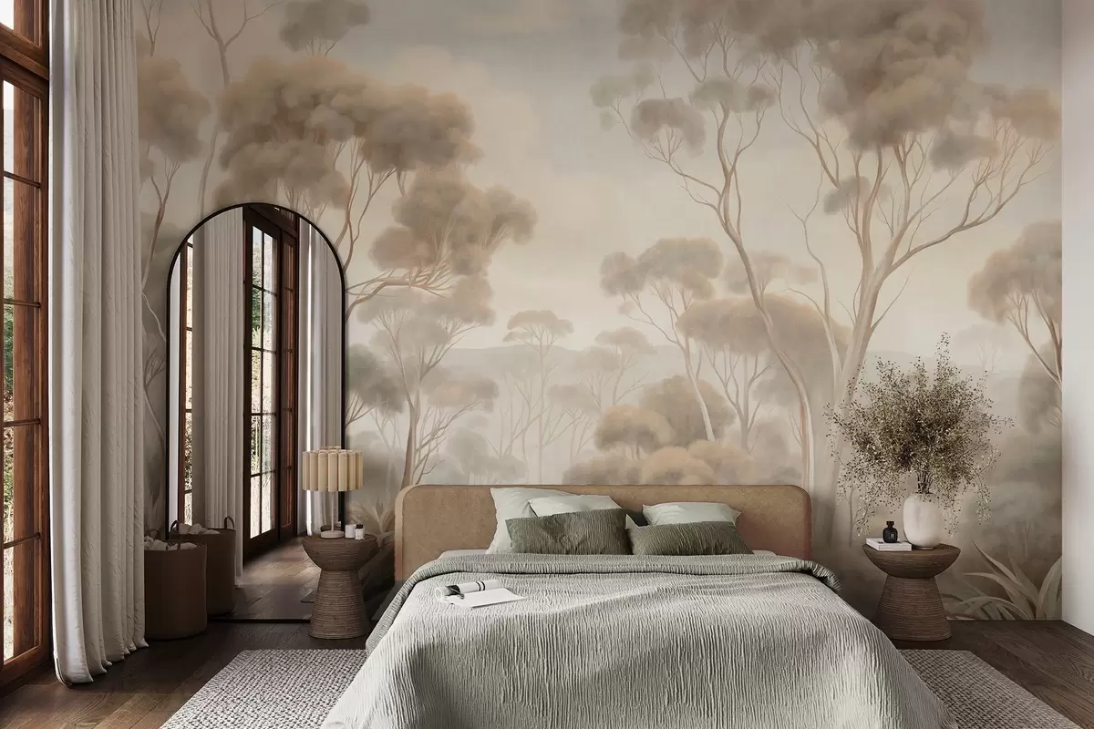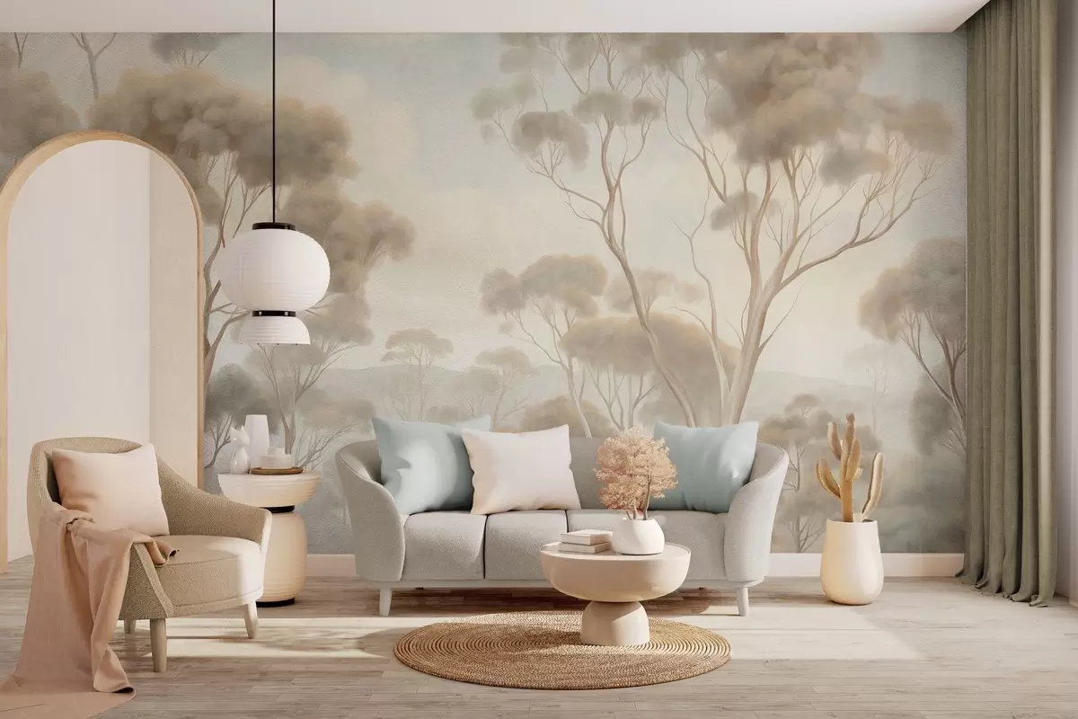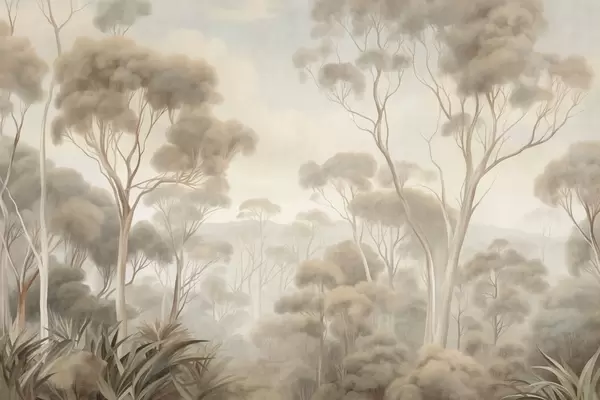 Fototapet Ett dimmigt skogslandskap med höga eukalyptusträd och böljande kullar under en molnig himmel, texturerad konst Nr. w09822