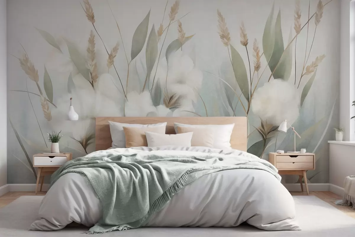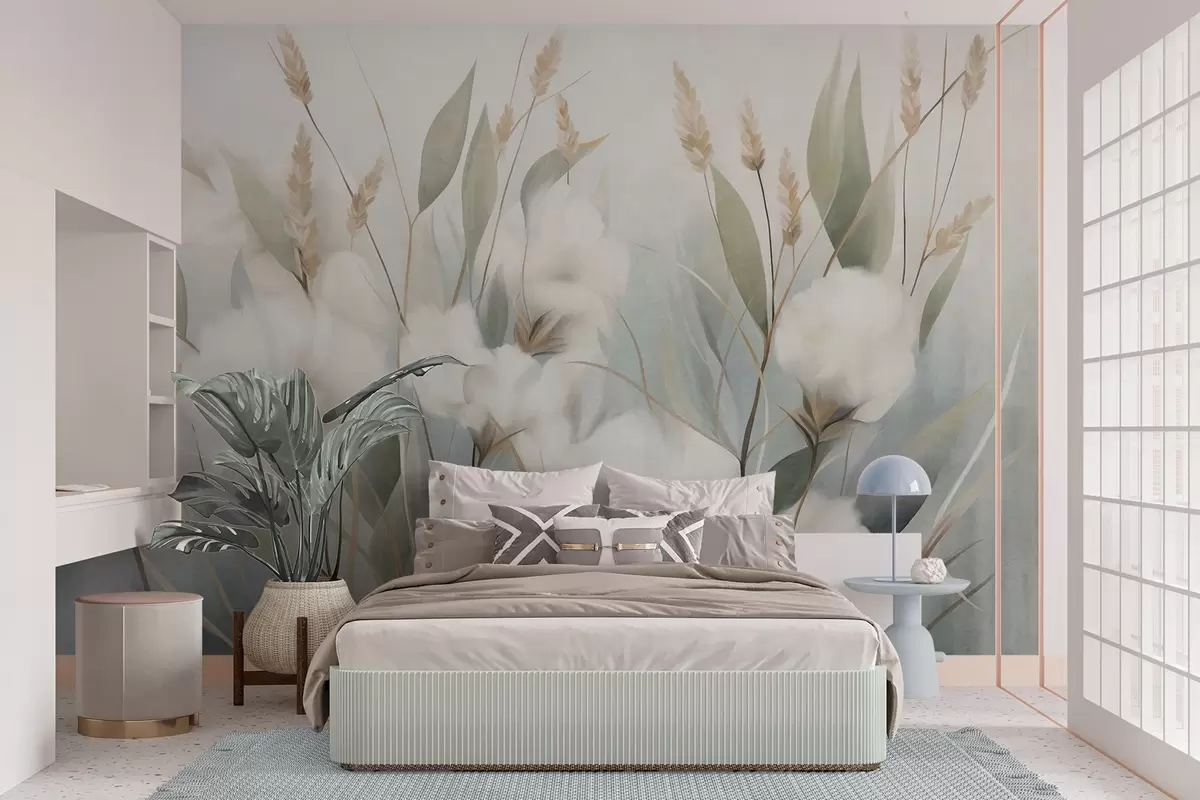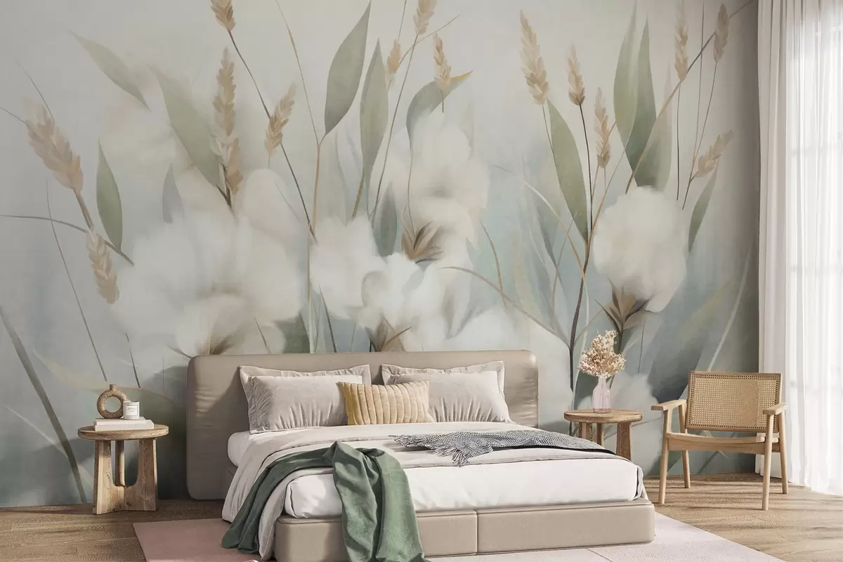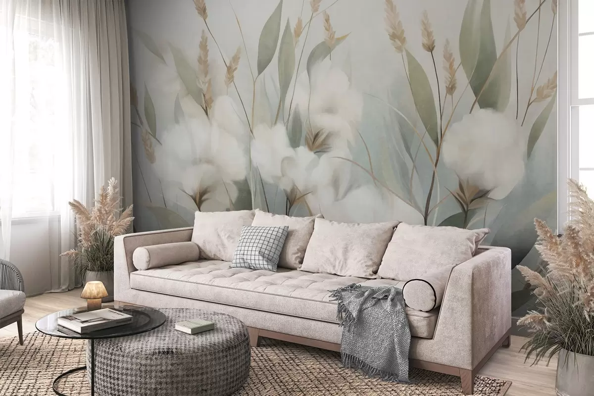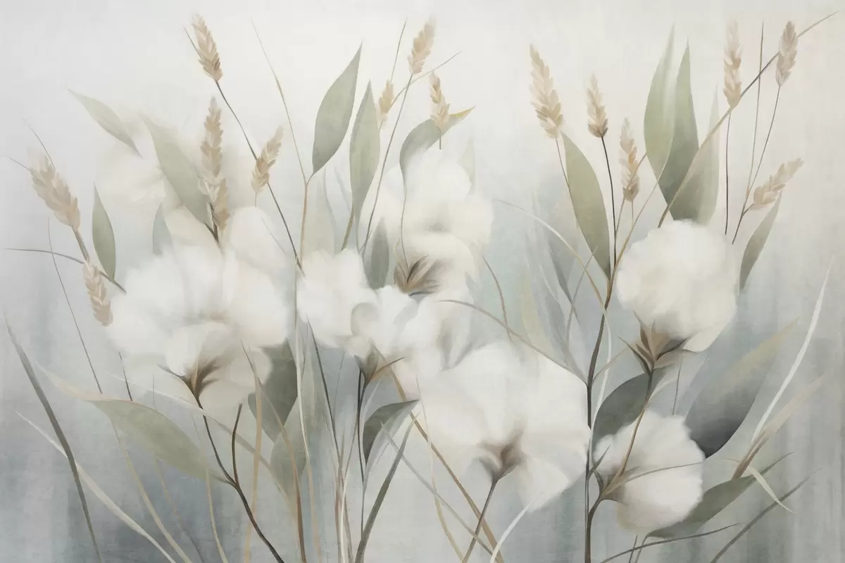 Fototapet Vita torkade blommor och högt gräs mot en mjuk, dämpad bakgrund, målad i impressionistisk stil Nr. w09823