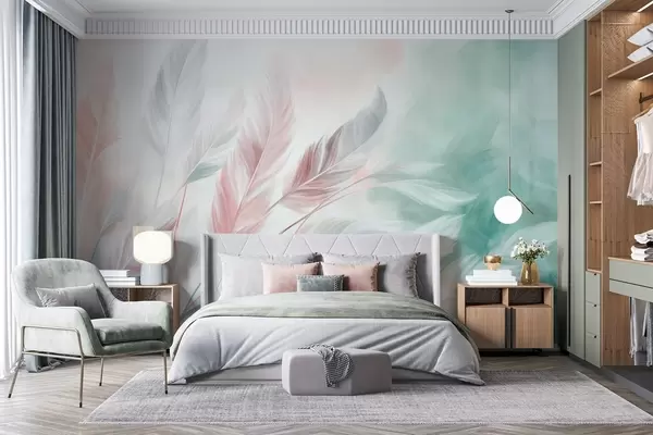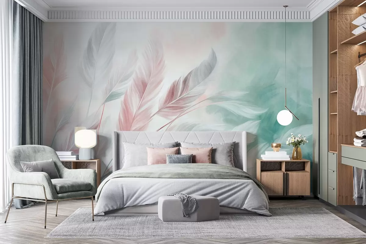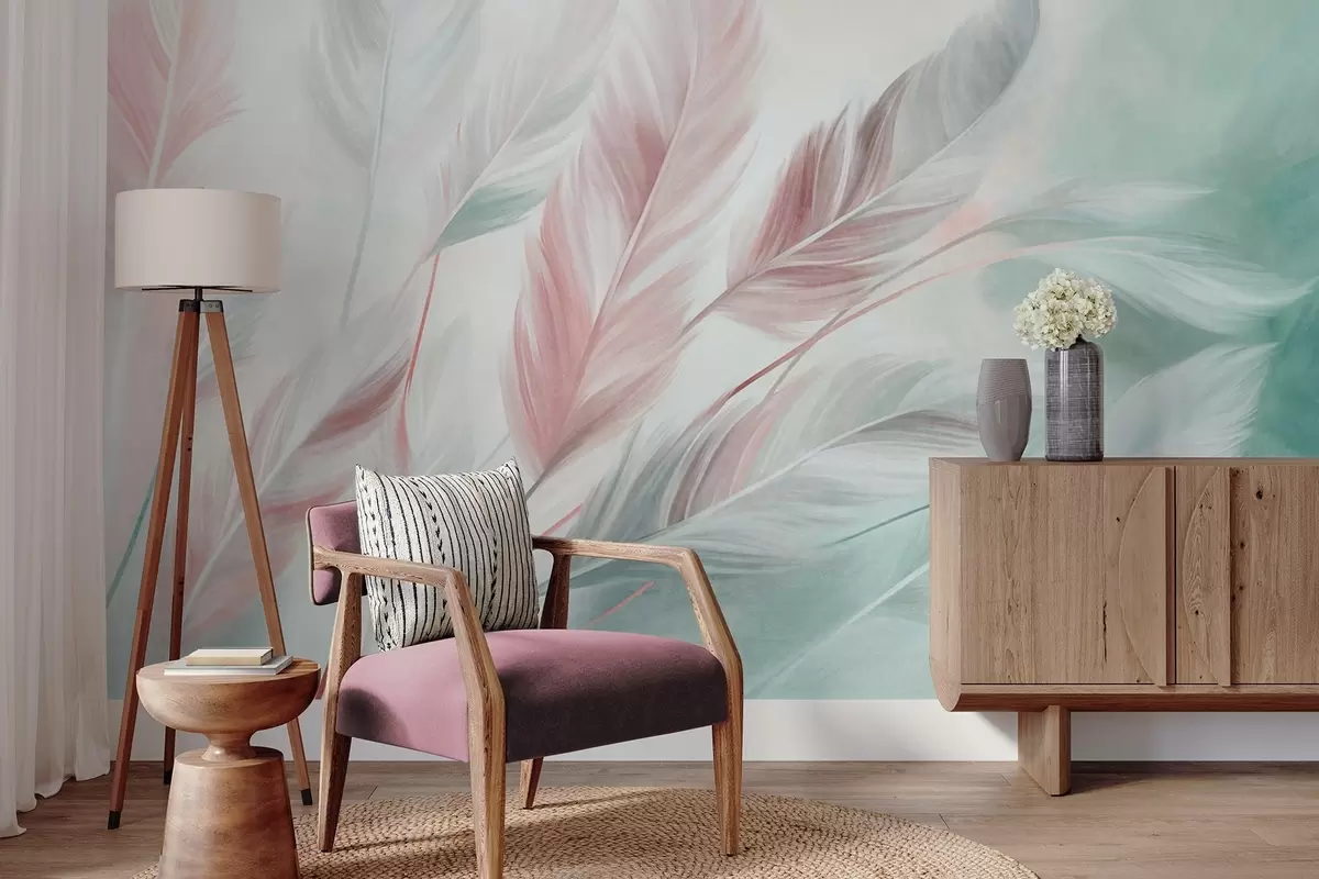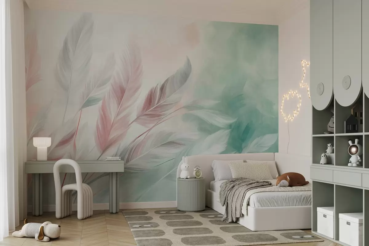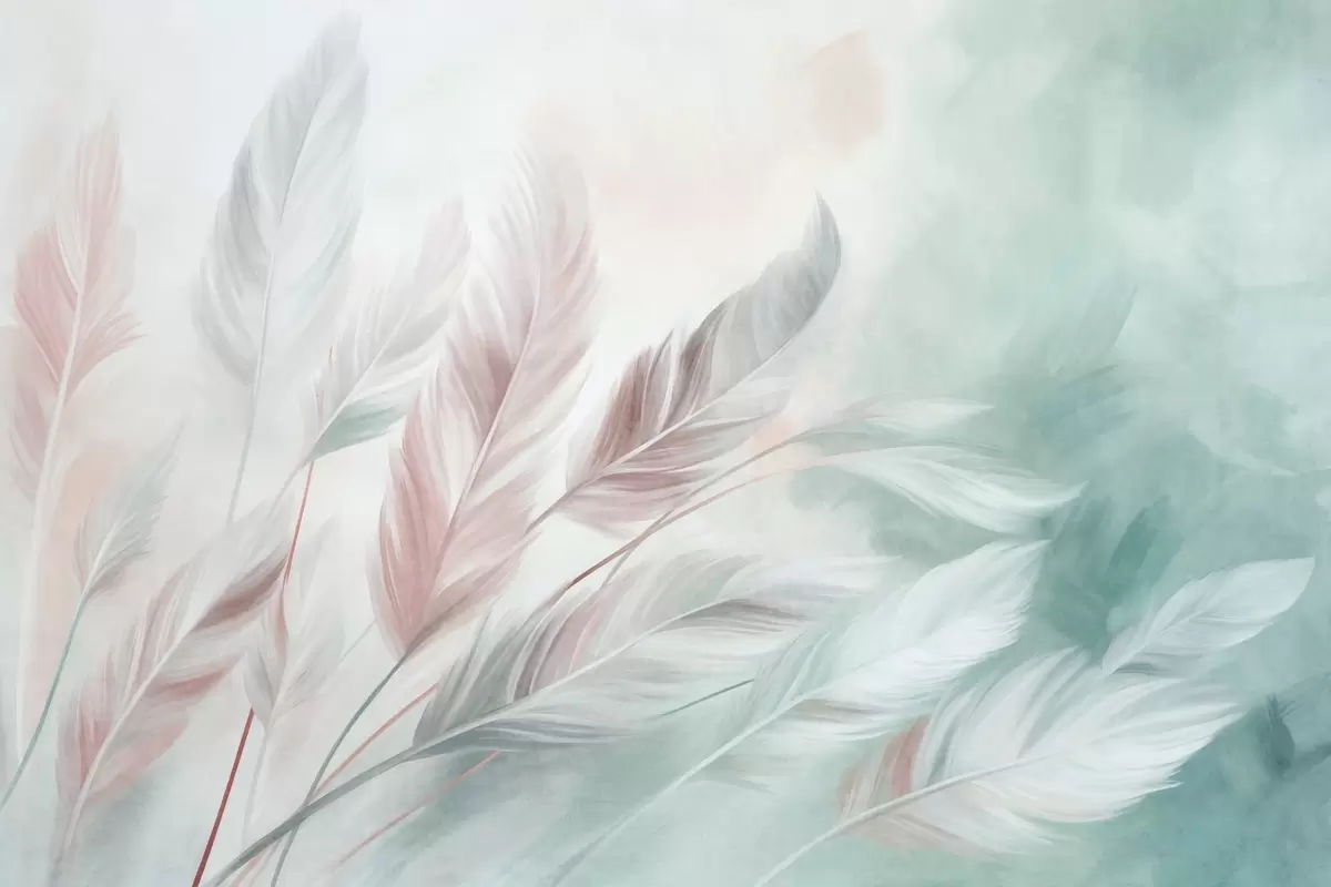 Fototapet Strukturerade pastellfärgade fjädrar med mjuka, skira kanter mot en bakgrund i akvarellstil Nr. w09833v1