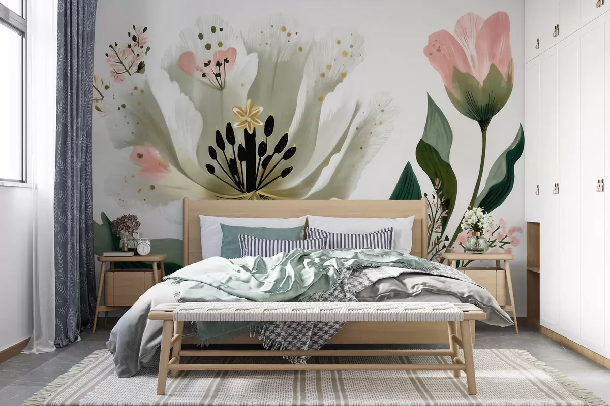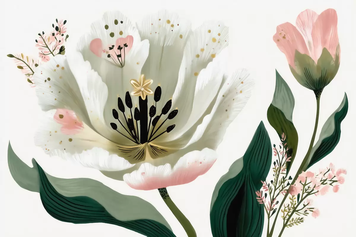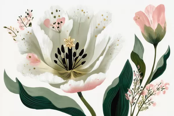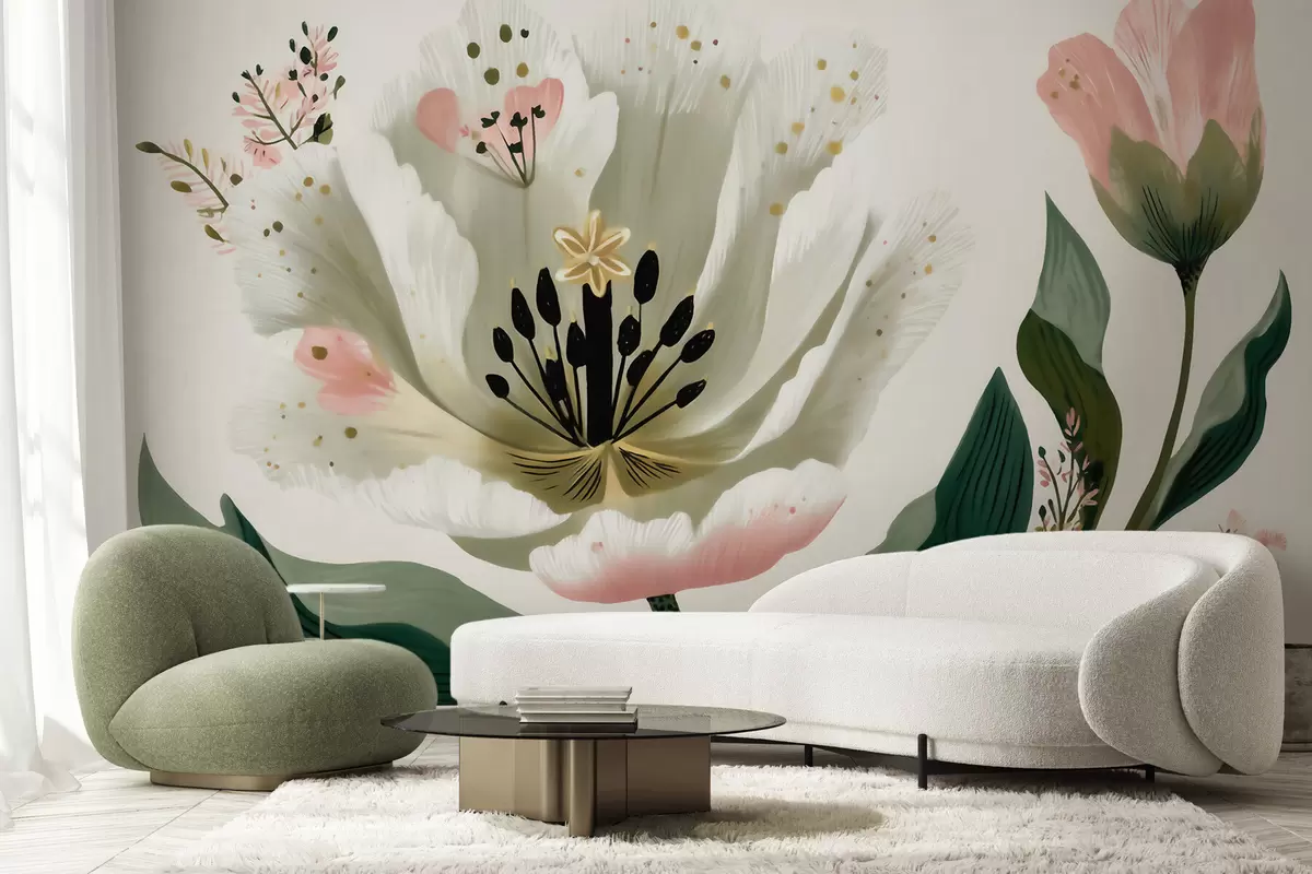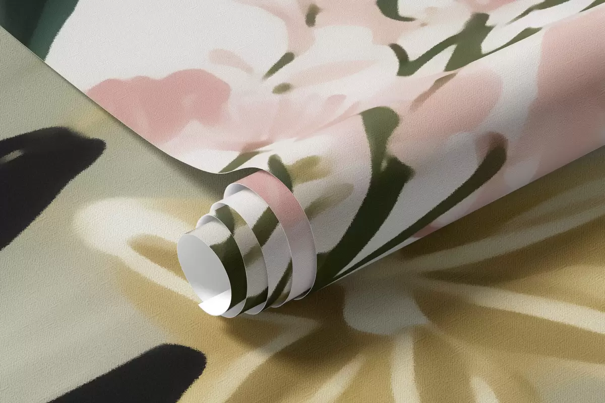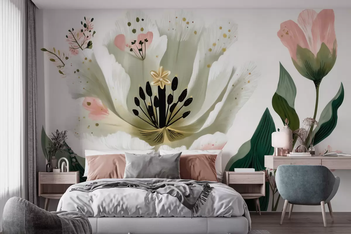 Fototapet En blomma med gröna blad och mjukrosa inslag i akvarellstil Nr. w09836