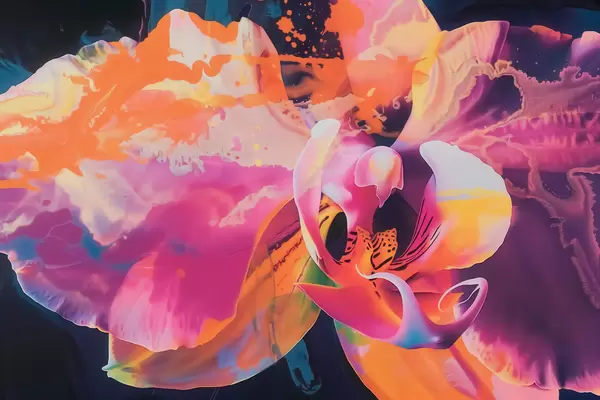 Fototapet En livfull abstrakt orkidéblomma med fylliga färger och dynamiska former i akvarellstil Nr. w09855