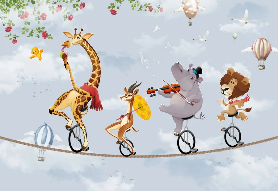 Lejonungar, giraffer och regnbågar i en pastellfärgad skog