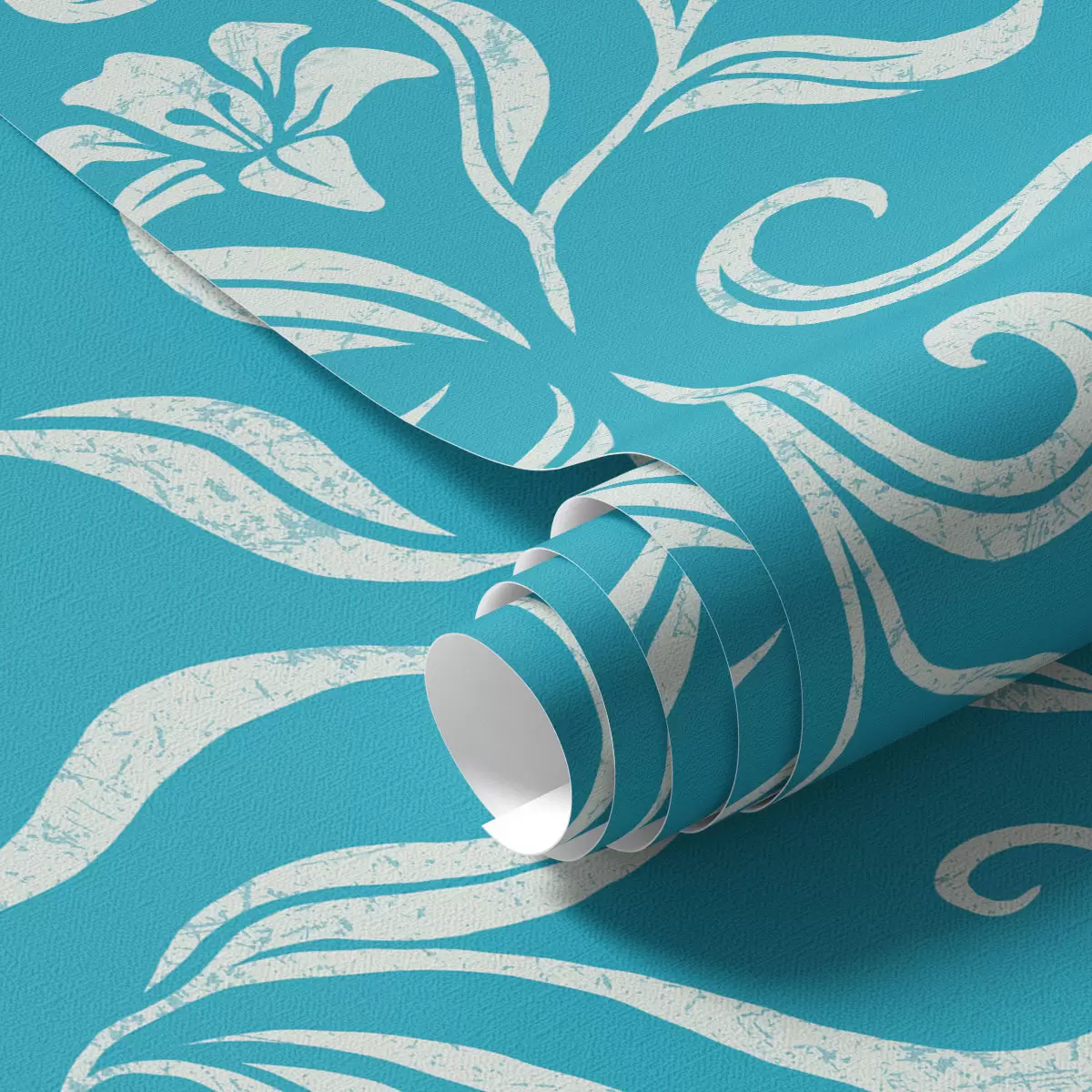 Tapet Vita blommor och blad med skav på blå bakgrund Nr. a00038