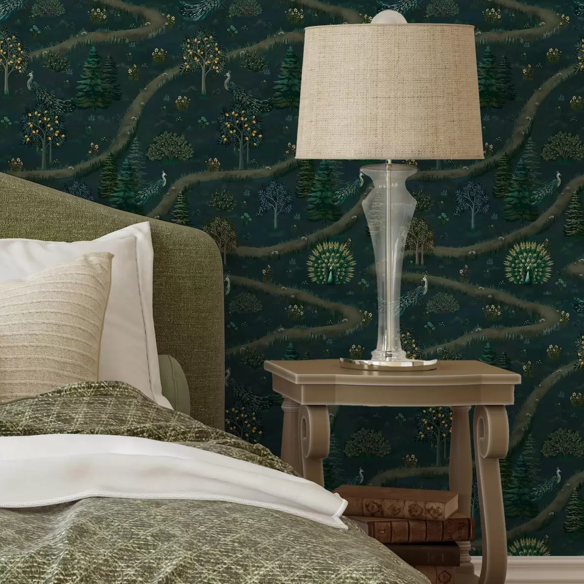 Tapet Slingrande stig med påfåglar och citronträd på mörk bakgrund Nr. a00041v1