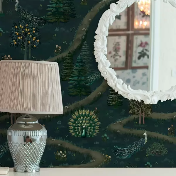 Tapet Slingrande stig med påfåglar och citronträd på mörk bakgrund Nr. a00041v1