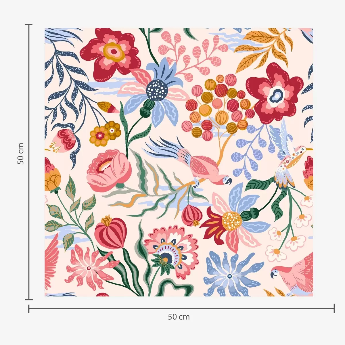 Tapet Komposition med ljusa blommor och bär med papegojor Nr. a00046