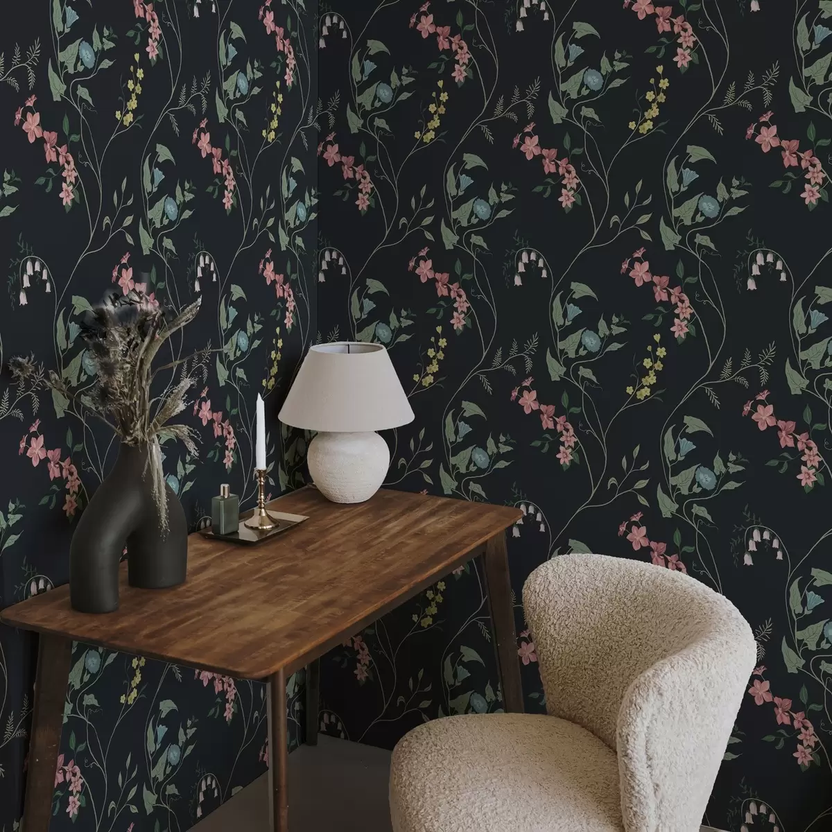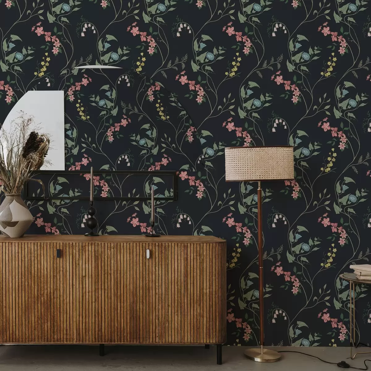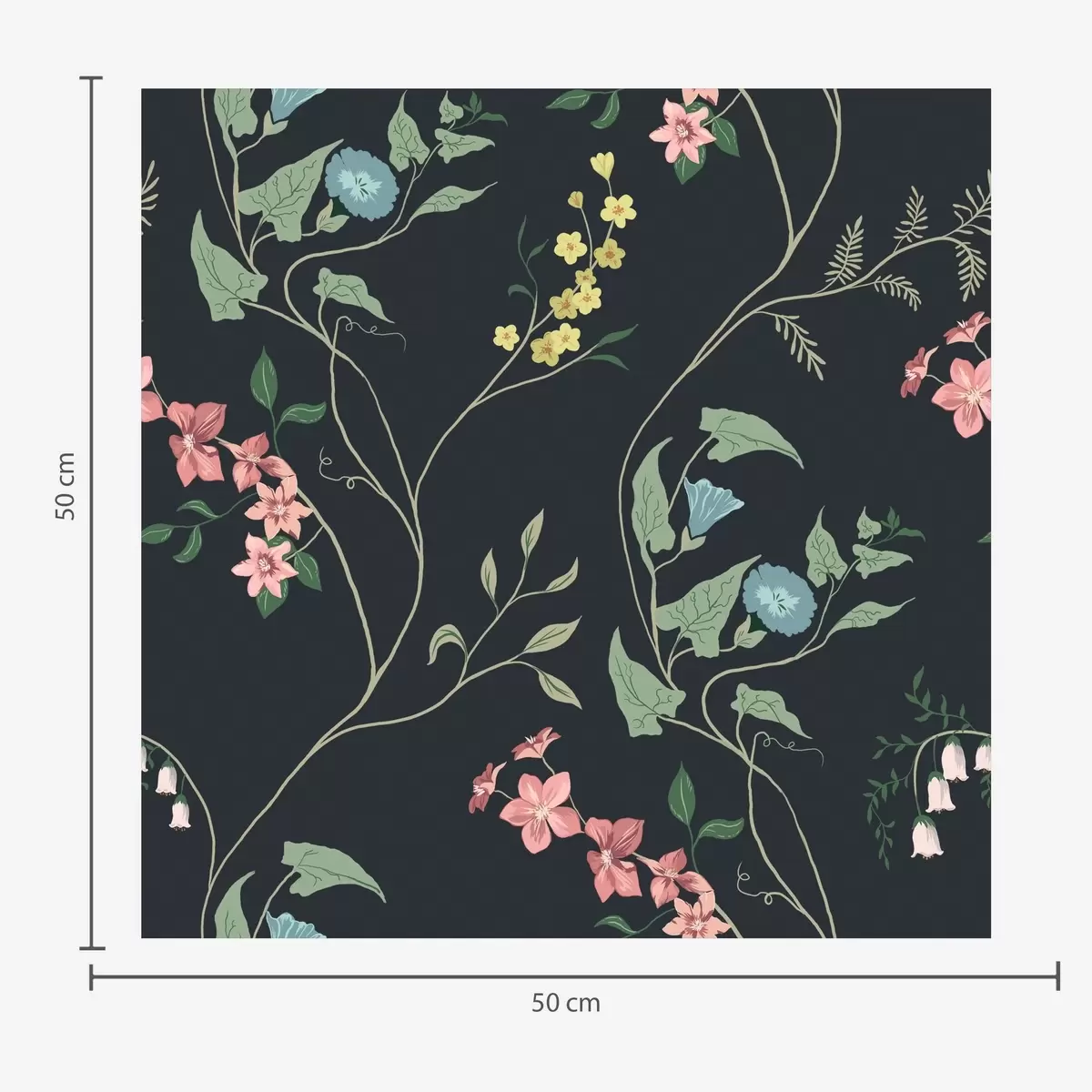 Tapet Blommor, blad och stjälkar på mörk bakgrund Nr. a00047