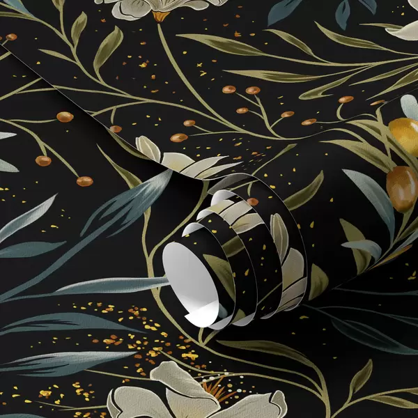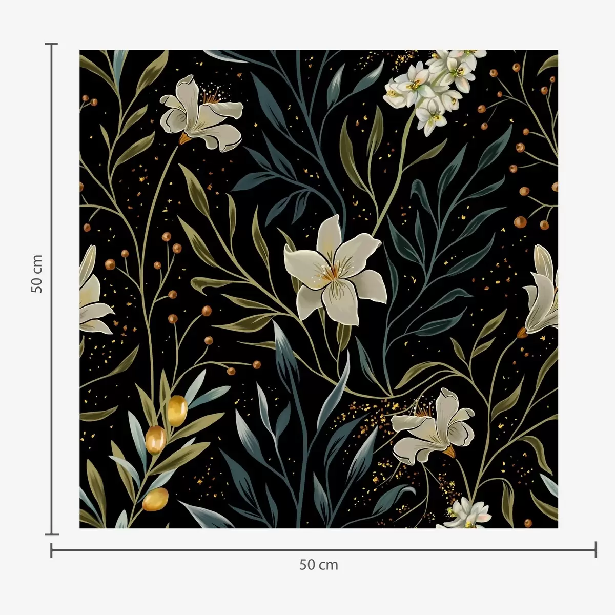 Tapet Komposition av ljusa blommor och mörka blad på en mörk bakgrund Nr. a00053