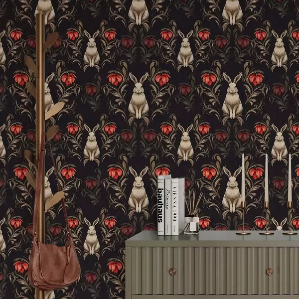 Tapet Hare och röda blommor på en mörk bakgrund Nr. a00102