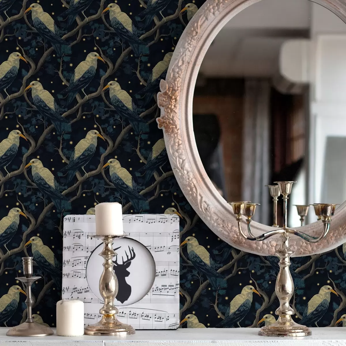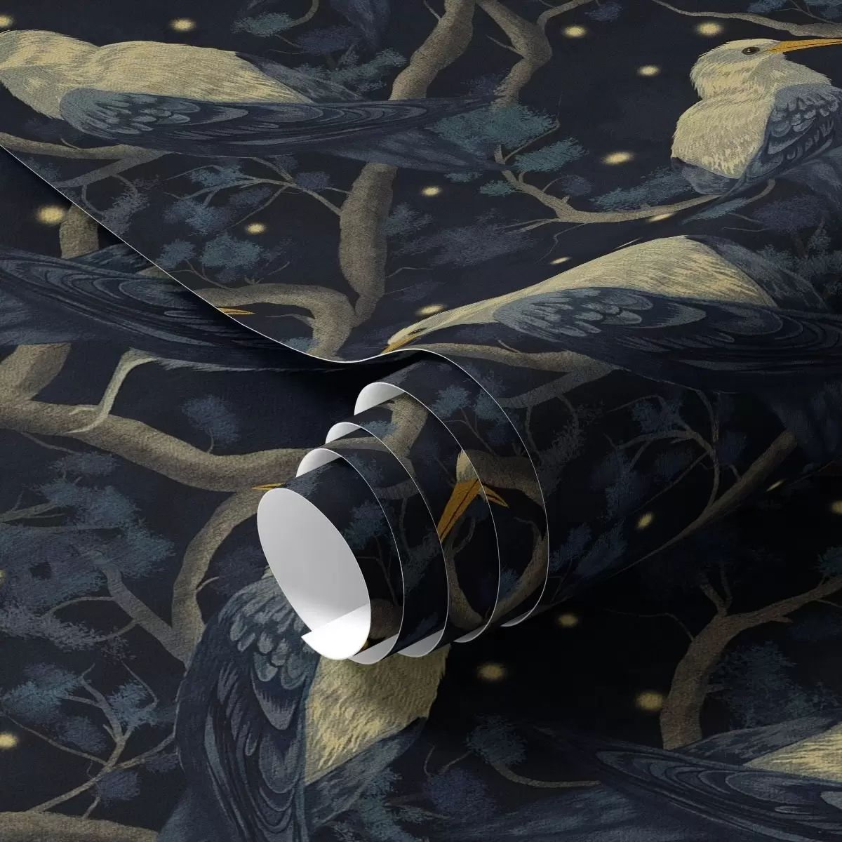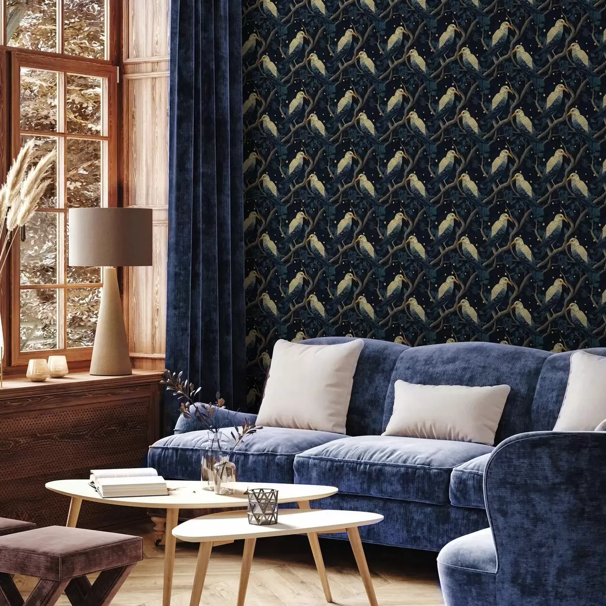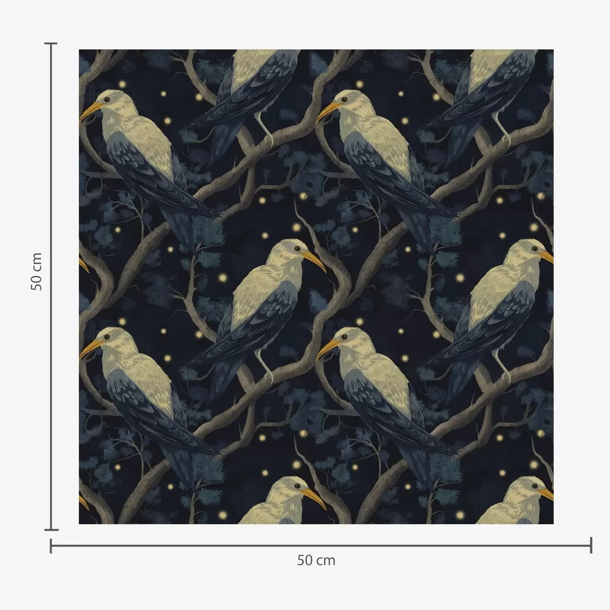 Tapet Nattfåglar på grenar och stjärnor på en mörkblå bakgrund Nr. a00109v1