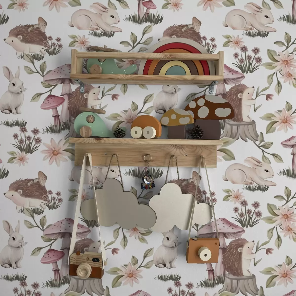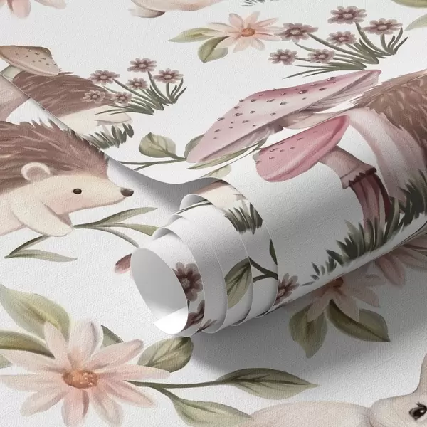 Tapet Igelkottar och kaniner på vit bakgrund med skira blommor och svampar Nr. a00111v2