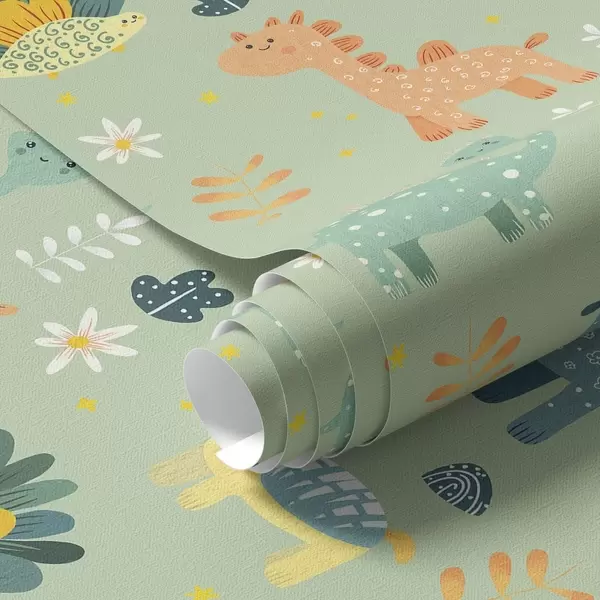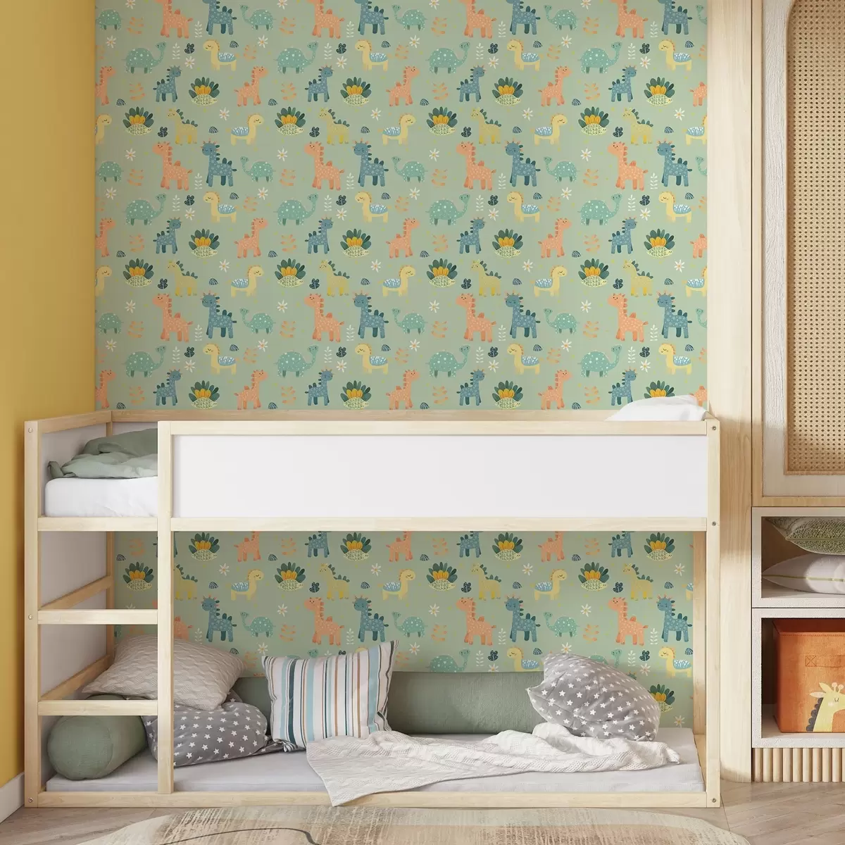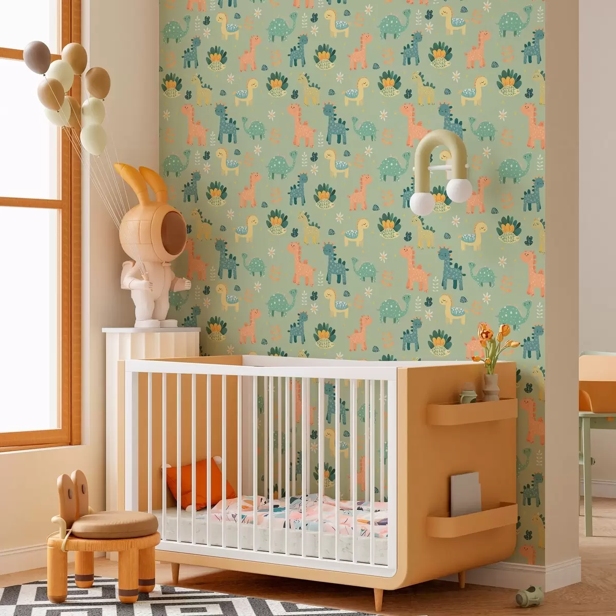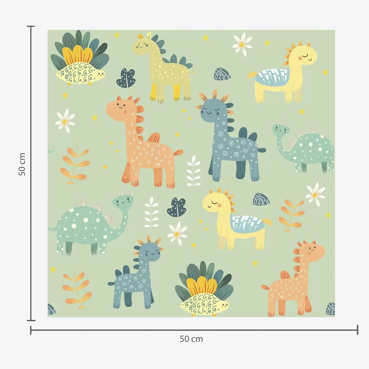 Tapet Roliga dinosaurier i en mjuk grön palett på en ljus bakgrund Nr. a00125v1