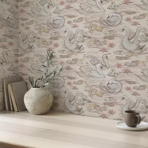 Tapet Svanar med ungar på rosa bakgrund med näckrosor Nr. a00176