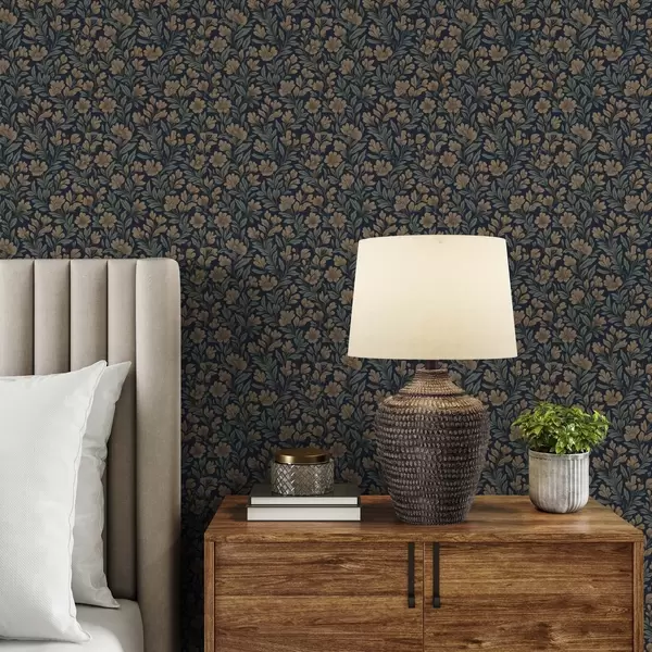 Tapet Orange blommor på en mörkblå bakgrund i vintagestil Nr. a00200