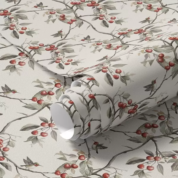 Tapet Fåglar bland körsbärsgrenar med röda bär Nr. a00206